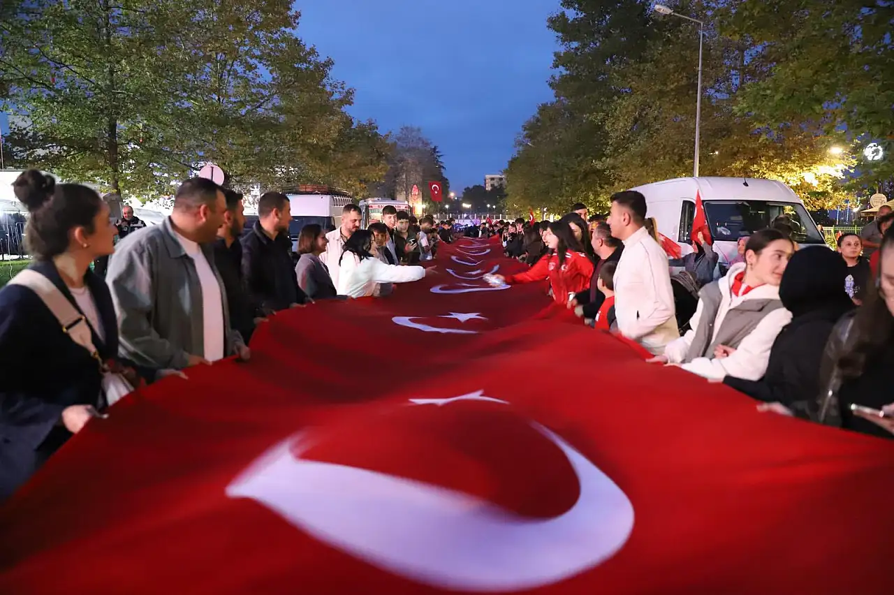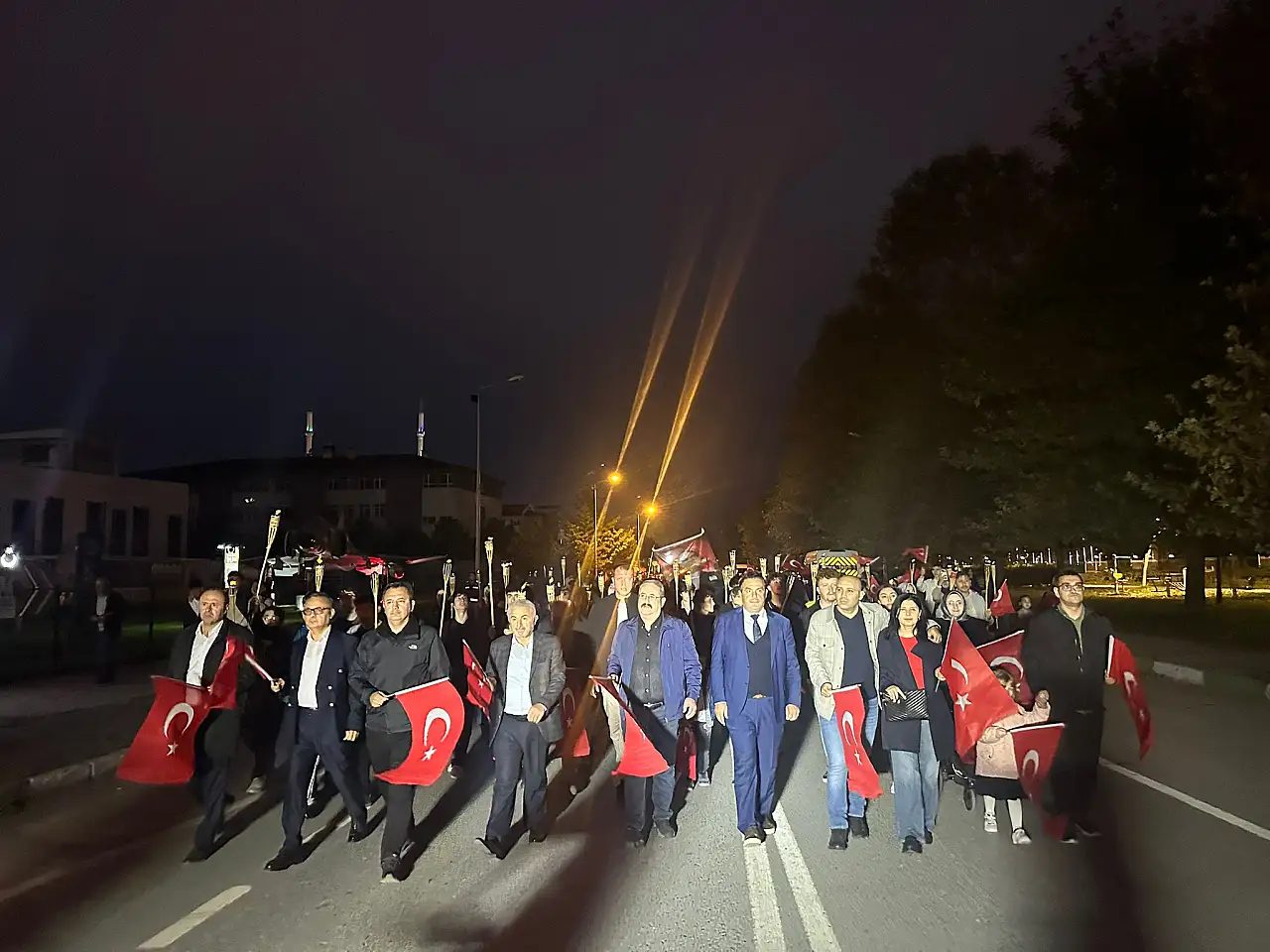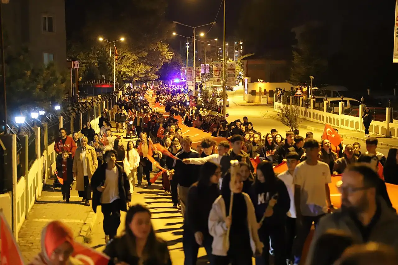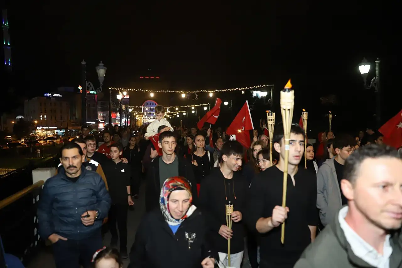 Yüzlerce vatandaş Türk bayraklarıyla ve fenerlerle Belediye Meydanı’na kadar marşlar eşliğinde yürüyüş gerçekleştirdi. Fener Alayı, tüm katılımcıların bando ekibine tebriklerinin ardından tamamlandı.