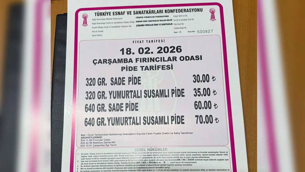 Çarşamba Fırıncılar Esnaf ve Sanatkarlar Odası 2026 yılı pide fiyat listesini açıkladı. Buna göre, göre 320 gram sade pide 30 TL, 640 gram sade pide fiyatı ise 60 TL olarak belirlendi.