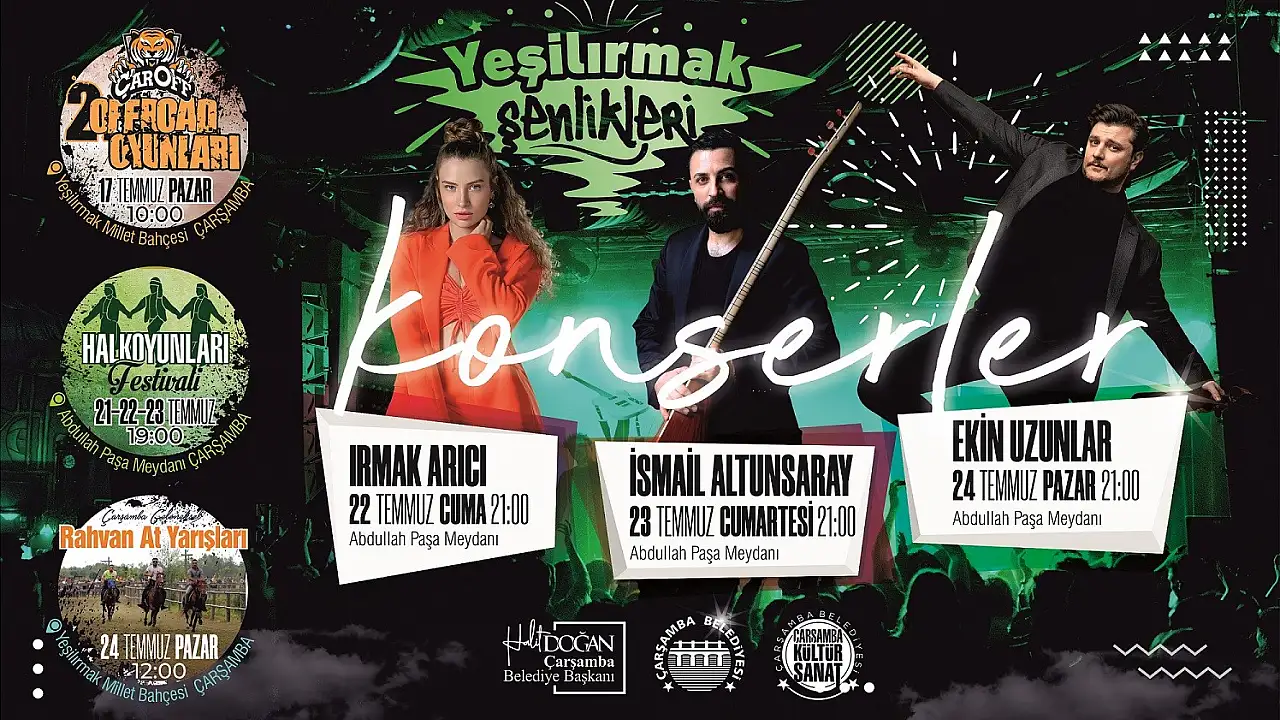 Geleneksel Yeşilırmak Şenlikleri'nde Ekin Uzunlar, Irmak Arıcı, İsmail Altunsaray konserleri, halk oyunları gösterileri, Off-Road ve rahvan at yarışları yapılacak. 17 Temmuz Pazar günü Off-Road Yarışları ile başlayacak olan şenlik programında; 21-22-23 Temmuz günleri halk oyunları gösterisi izleyiciler ile buluşacak. 22 Temmuz’da Irmak Arıcı, 23 Temmuz’da İsmail Altunsaray, 24 Temmuz’da ise Ekin Uzunlar şenlikte konser verecek. Geleneksel rahvan at yarışları 24 Temmuz günü sporseverlere heyecan dolu anlar yaşatacak. “Çarşamba’nın adını duyurmaya devam ediyoruz”