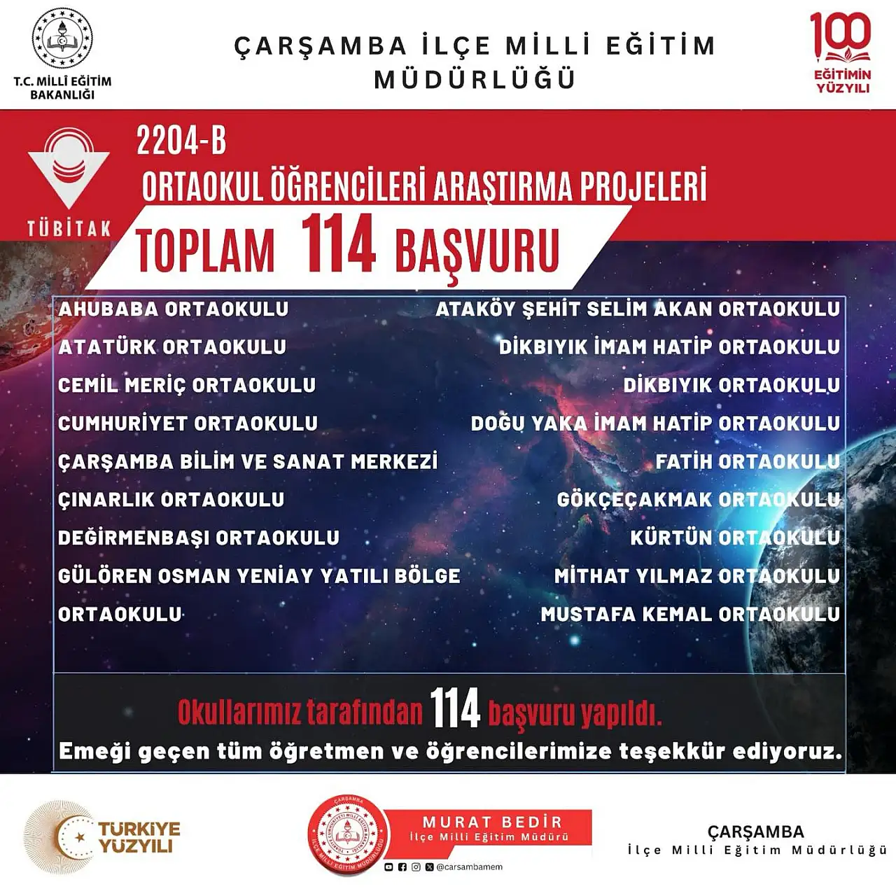 TÜBİTAK tarafından düzenlenen 2204-B Ortaokul Öğrencileri Araştırma Projeleri Yarışması'na Samsun'un Çarşamba ilçesinden 17 okul tarafından 114 proje ile başvuru yapıldı.