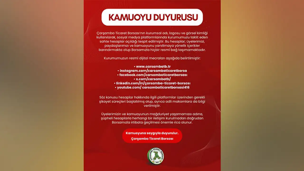 Çarşamba Ticaret Borsası, kurum adına açılan sahte sosyal medya hesaplarına karşı uyarıda bulunarak resmî mecralarını paylaştı. Vatandaşların mağdur olmaması için şüpheli hesaplarla iletişim kurulmaması istendi.