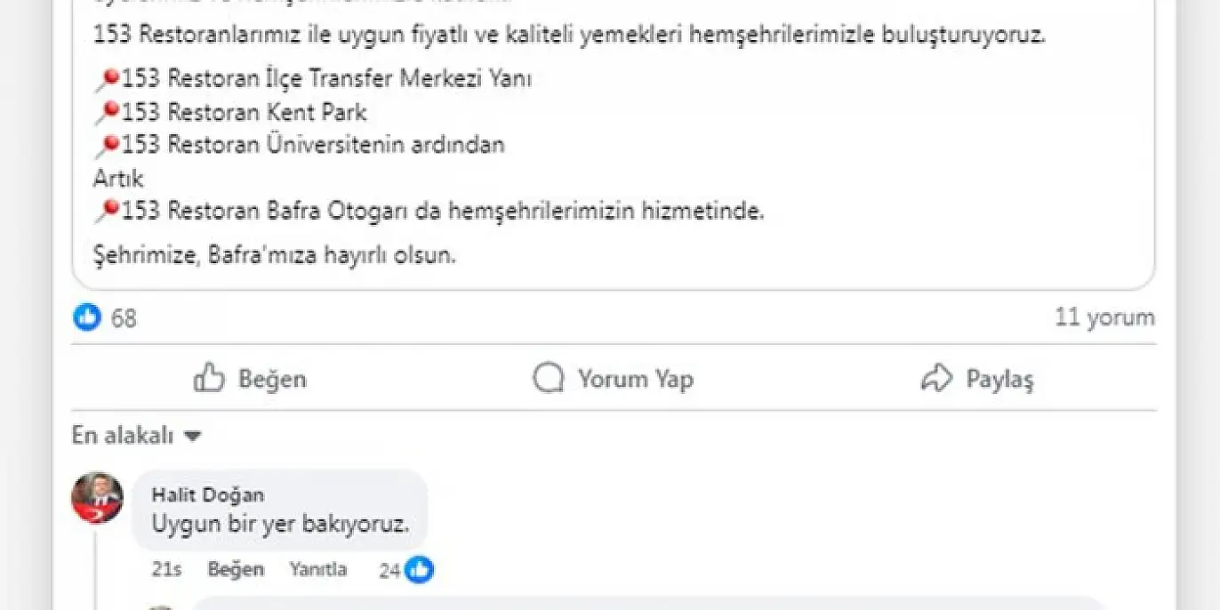 Son olarak 26 Mayıs 2025 tarihinde gerçekleşen Bafra’daki açılışın ardından gözler Çarşamba’ya çevrildi. Vatandaşların yoğun talepleri, sosyal medya üzerinden doğrudan Başkan Halit Doğan’a ulaştırıldı. Halit Doğan ise “Uygun bir yer bakıyoruz” ifadeleriyle yeni bir şubenin planlaması için çalışmaların sürdüğünü duyurdu. Ancak aradan geçen zamana rağmen Çarşamba ilçesinde henüz bir 153 Restoran açılmış değil.