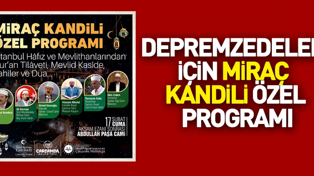 Tüm Türkiye’yi yasa boğan Kahramanmaraş merkezli deprem felaketinin ardından Çarşamba Belediyesi’nin düzenleyeceği ‘Miraç Kandili Özel Programı’nda depremde vefat edenleri dualar ile anılacak. Abdullah Paşa Cami’nde akşam ezanı sonrası düzenlenecek kandil programında; Türk Tasavvuf Müziği sanatçısı Mehmet Kemiksiz, Şişli Mecidiyeköy Merkez Cami Baş İmam Hatibi Ali Derman, Üsküdar Valide-i Cesid Cami Müezzini Ahmet Uzunoğlu, Üsküdar Büyük Çamlıca Cami Müzzein- Kayyım Hüseyin Akbulut, Beylerbeyi Hamid-i Evvel Cami İmam Hatibi Ramazan Kutlu ve Ümraniye Cevher Ağa Cami Müezzini İdris Erdem yer alacak. İstanbul hafız ve mevlithanlarından Kur’an tilaveti, mevlid kaside, ilahiler ve dualar, depremden etkilenenler için okunacak.
