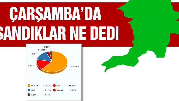 Yurtta bu gelişmeler yaşanırken Çarşamba İlçesi’nde de partilerin oy oranlarında değişim yaşandı. 2011 seçimlerinde Çarşamba İlçesi’nden 53 bin 470 oy alan AK Parti , 2015 Genel Seçimleri’nde yaklaşık 5 bin oy düşüş yaşadı. 48 bin 573 seçmenin oyunu alabilen AK Parti %61,66’lık yüzde ile ilçeden birinci parti olarak çıktı.