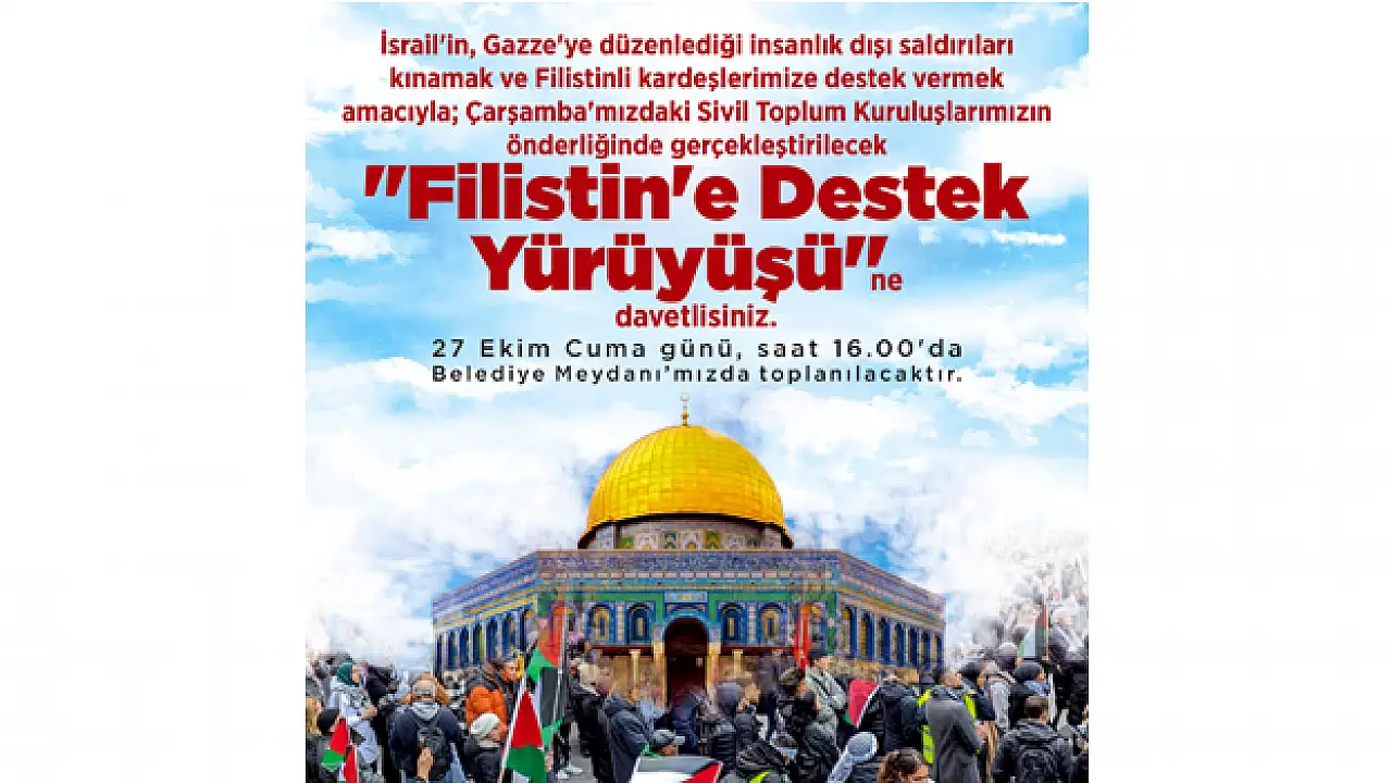 Çarşambalılar, Gazze’ye yapılan saldırılara karşı, Filistin halkının yanında olduğunu göstermek ve yapılan saldırıları kınamak için yürüyor. Çarşamba’daki sivil toplum kuruluşlarının önderliğinde düzenlenen "Filistin'e Destek Yürüyüşü" için vatandaşlar 27 Ekim Cuma günü saat 16.00’da Çarşamba Belediye Meydanı’nda toplanacak.