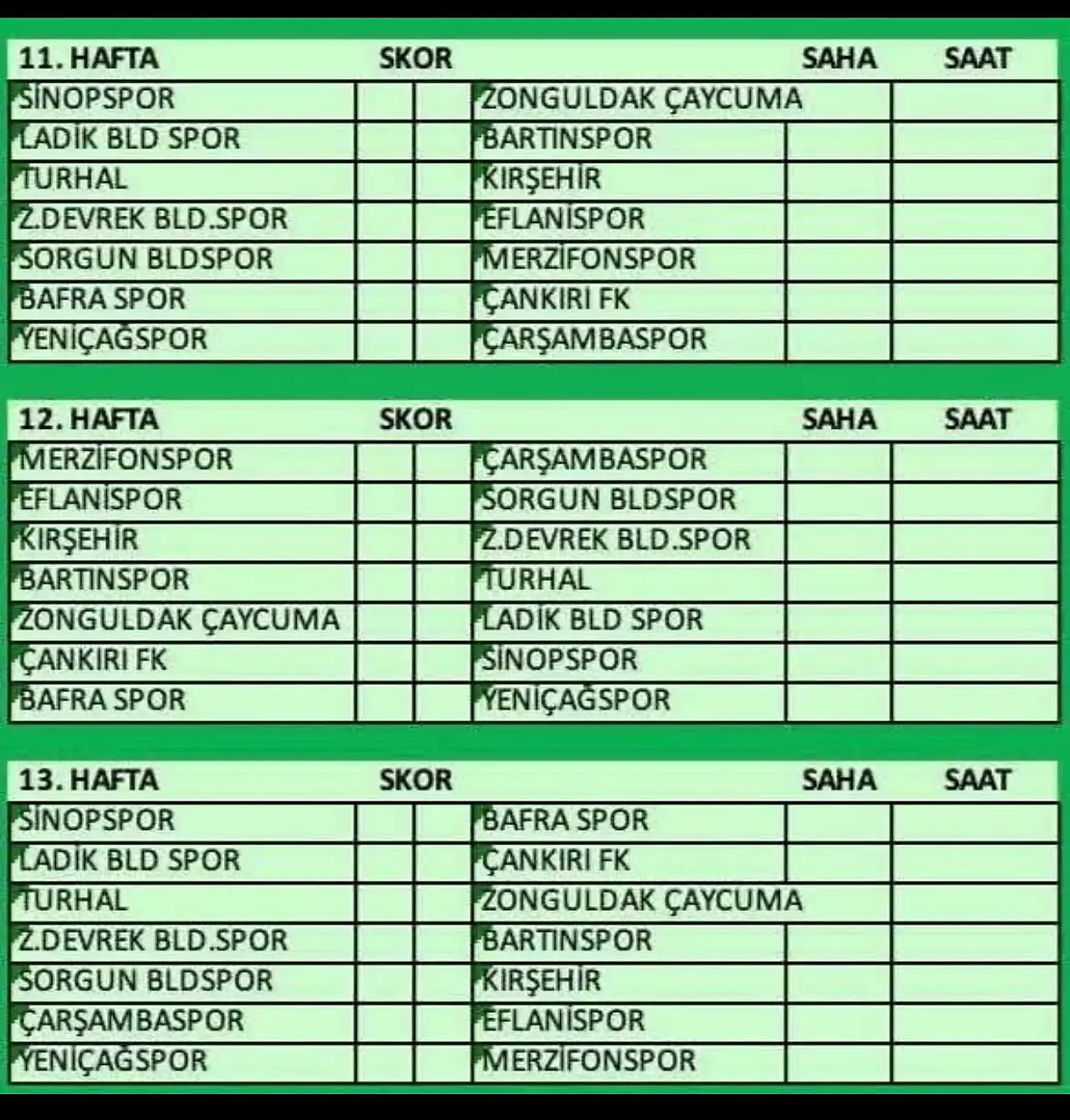 Çarşambaspor, ligin ilk haftasında Kırşehir takımı karşılaşırken, ikinci hafta sahasında Bartınspor’u ağırlayacak. Üçüncü hafta da Zonguldak Çaycuma ile deplasmanda karşılaşacak yeşil beyazlı ekip dördüncü hafta evinde Çankırı FK takımını konuk ederken, beşinci hafta da ise Bafraspor’a konuk olacak.