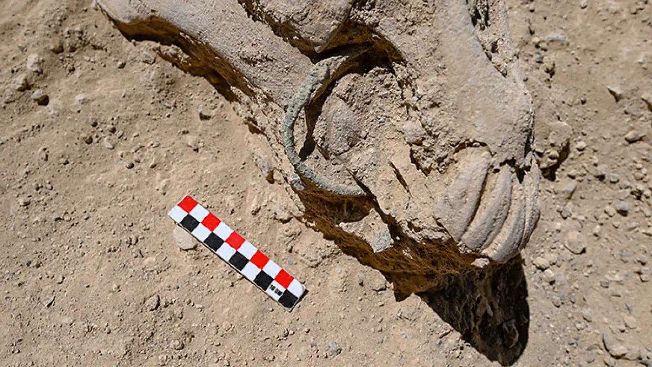 Geçen yıl Urartu yönetici sınıfına ait olduğu değerlendirilen iskeletin ortaya çıkarıldığı noktada, bu sene de çenesinde bronz gem (binek hayvanını yönlendirmek için ağzının içine takılan metal parça) olan at iskeleti bulundu.