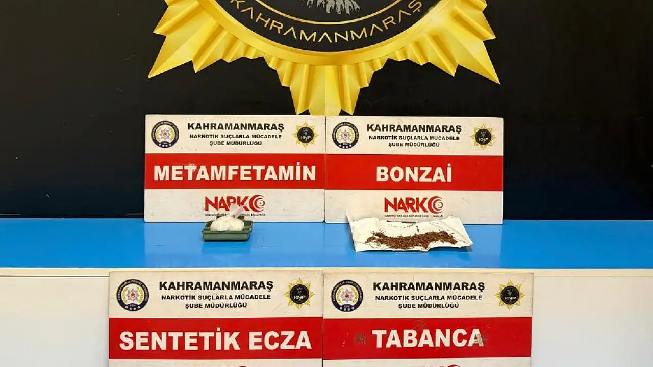 Yapılan aramalarda ise 47,25 gram esrar, 61,2 gram metamfetamin, 39,65 gram bonzai, 580 sentetik ecza, 105 kök hint keneviri, 4'ü tabanca, 8 silah ele geçirildi.