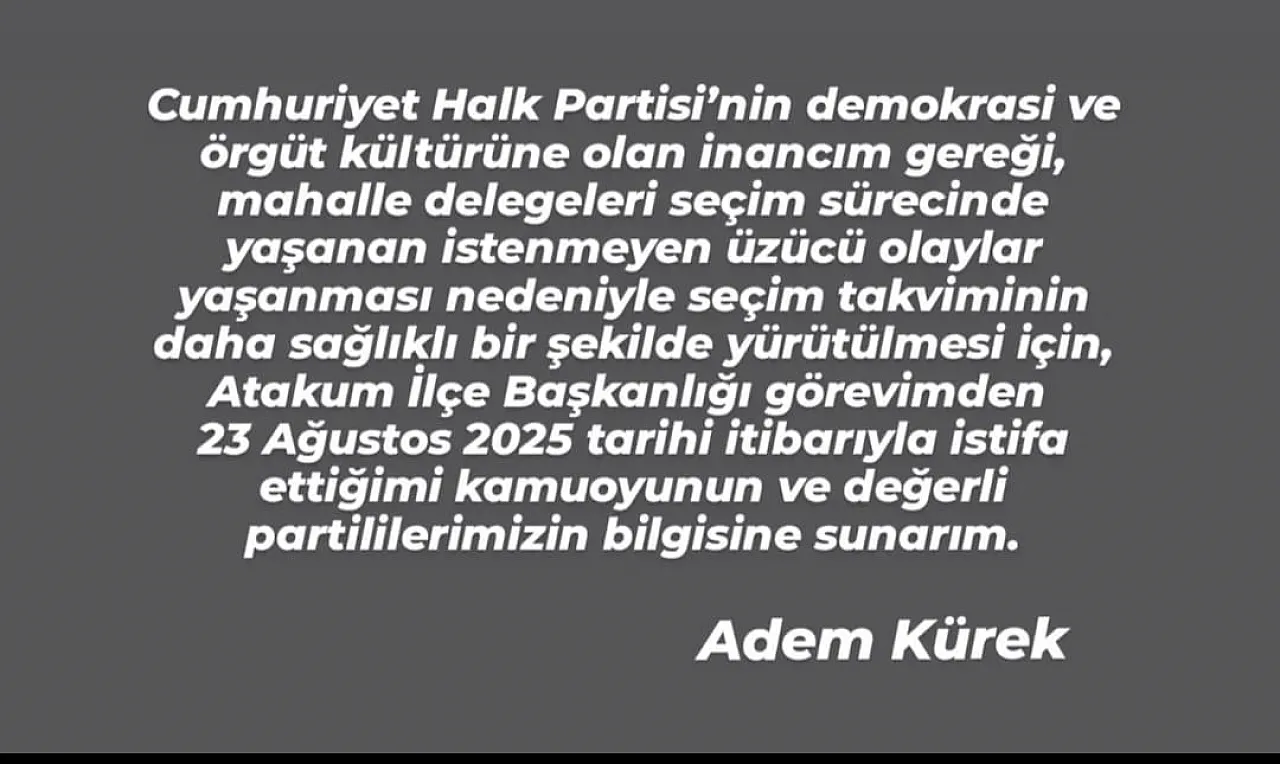 "Cumhuriyet Halk Partisi’nin demokrasi ve örgüt kültürüne olan inancım gereği, mahalle delegeleri seçim sürecinde yaşanan istenmeyen üzücü olaylar nedeniyle seçim takviminin daha sağlıklı bir şekilde yürütülmesi için, Atakum İlçe Başkanlığı görevimden 23 Ağustos 2025 tarihi itibarıyla istifa ettiğimi kamuoyunun ve değerli partililerimizin bilgisine sunarım."