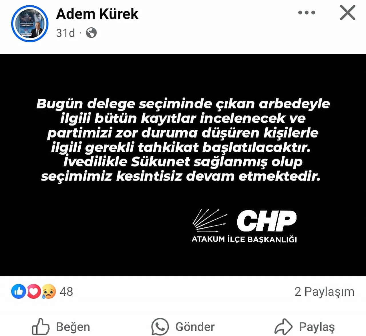 CHP Atakum İlçe Başkanı Adem Kürek, Cumhuriyet mahallesi delege seçimlerinde yaşanan kavga sonrası sosyal medya hesabından açıklama yaptı. Başkan Kürek, seçim sırasında çıkan arbedeyle ilgili tüm kayıtların inceleneceğini ve partiyi zor duruma düşüren kişiler hakkında gerekli tahkikatın başlatılacağını belirtti.