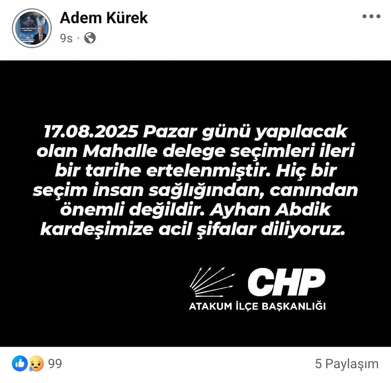 Mevcut Atakum İlçe Başkanı Adem Kürek, “17.08.2025 Pazar günü yapılacak olan mahalle delege seçimleri ileri bir tarihe ertelenmiştir. Hiçbir seçim insan sağlığından, canından önemli değildir.” dedi.