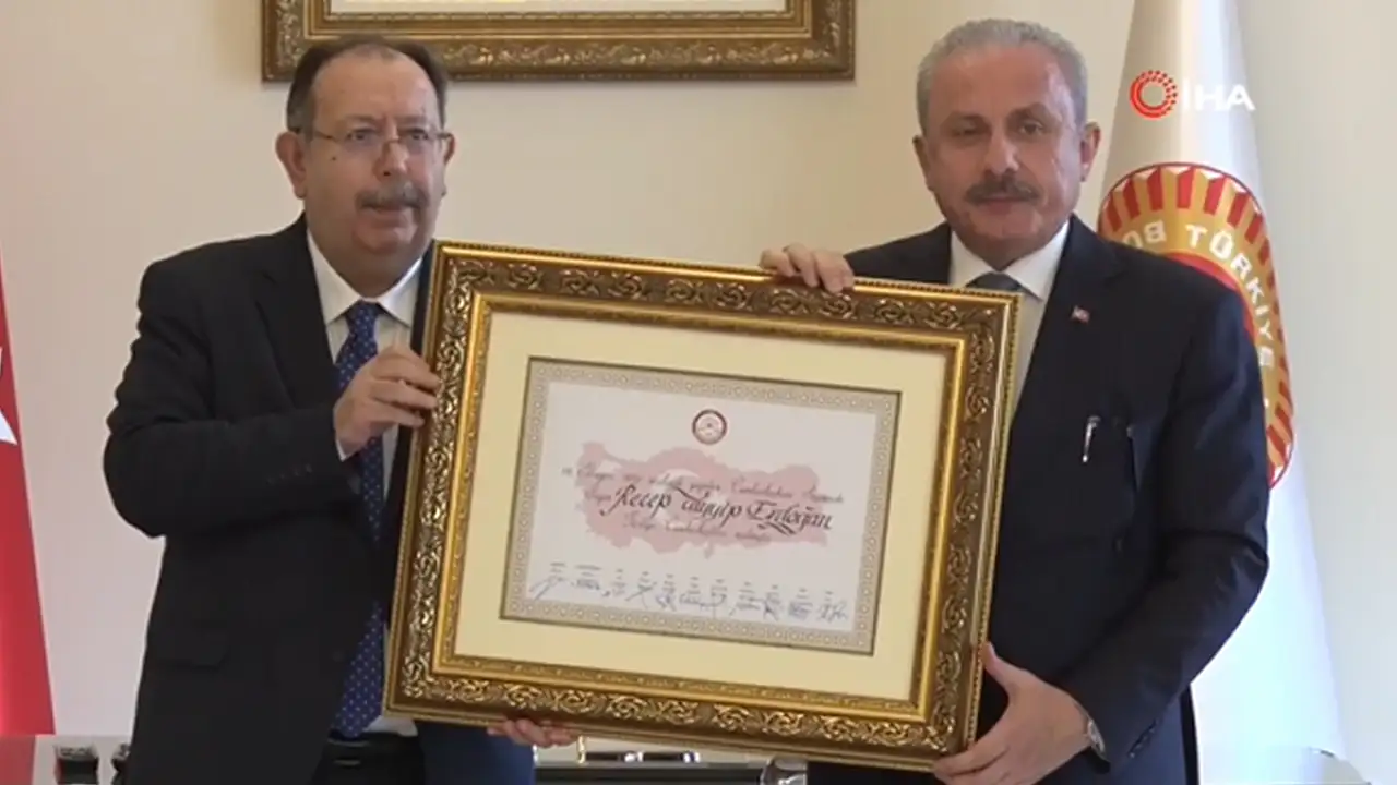 Cumhurbaşkanı Recep Tayyip Erdoğan'ın mazbatası kendisine verilmek üzere Meclis Başkanı Mustafa Şentop tarafından alındı.