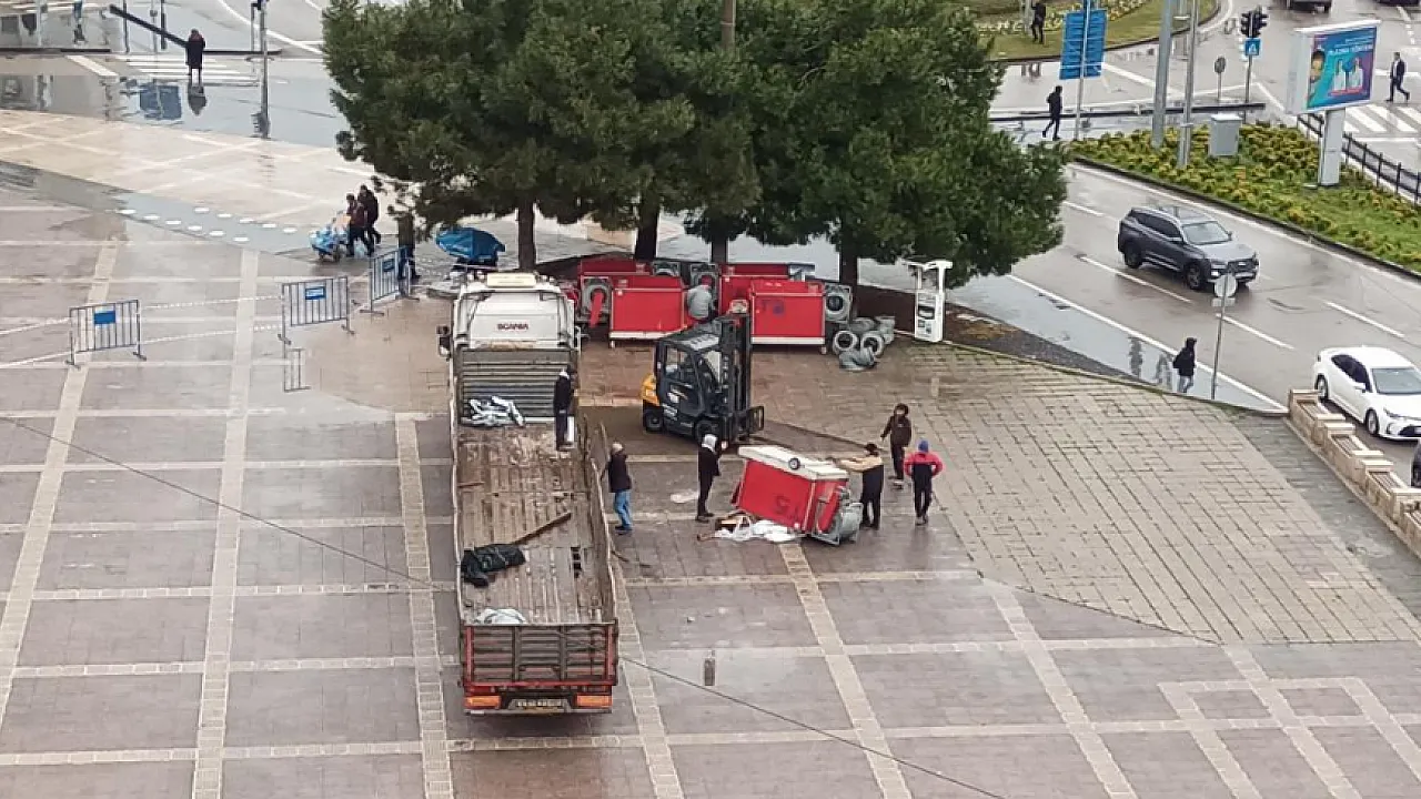 Olay, Cumhuriyet Meydanı’nda kurulması planlanan Ramazan çadırında kullanılacak malzemelerin alana indirilmesi sırasında meydana geldi. Havalandırma üniteleri, tırla meydanda belirlenen noktaya getirildi.