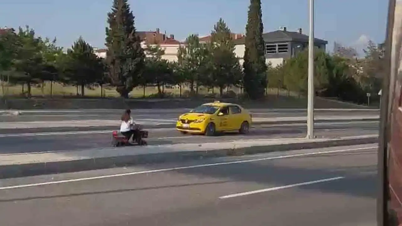 Tekirdağ'ın Malkara ilçesinden geçen D-110 kara yolunda bir çocuk, elektrikli bisikletiyle ters yönde ilerlerken cep telefonu kamerasıyla görüntülendi.