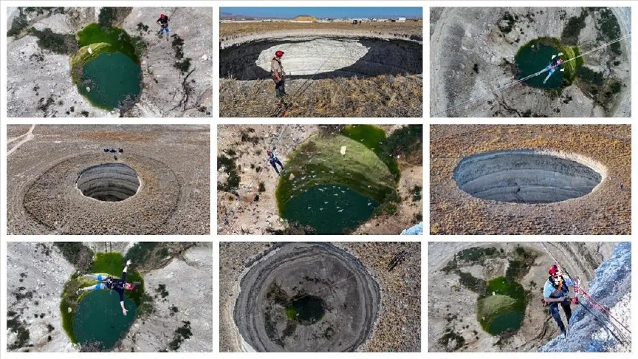 Konya'nın Karapınar ilçesinde, iklim değişikliği, kuraklık ve yer altı suyu kullanımının doğurduğu obruk tehlikesine dikkat çekmek isteyen profesyonel dağcılar, 40 metre derinliğindeki İnoba Obruğu'na iniş gerçekleştirdi.