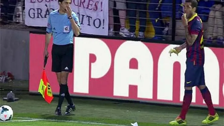 Barcelona, ilk yarısını 2-0 geride kapattığı maçı 3-2 kazanmayı başarırken, Villarreal taraftarının ırkçı saldırısı Barcelona’nın geri dönüşüne gölge düşürdü. Eski teknik direktörü Tito Vilonova’nın hayatını kaybetmesinin üzerine morali bozuk olan Barcelona, maç sırasında ayrı bir üzücü bir olay yaşadı. Maçın 75. dakikasında Barcelona’nın Brezilyalı futbolcusu Dani Alves korner kullanmak için çeyrek daireye gittiğinde Villareal taraftarı maymun sesleri çıkardı ve bir taraftar sahaya muz fırlattı. Yapılan ırkçı tezahüratlara Dani Alves yere atılan muzu yiyerek tahammülü olmadığını zekice gösterdi.