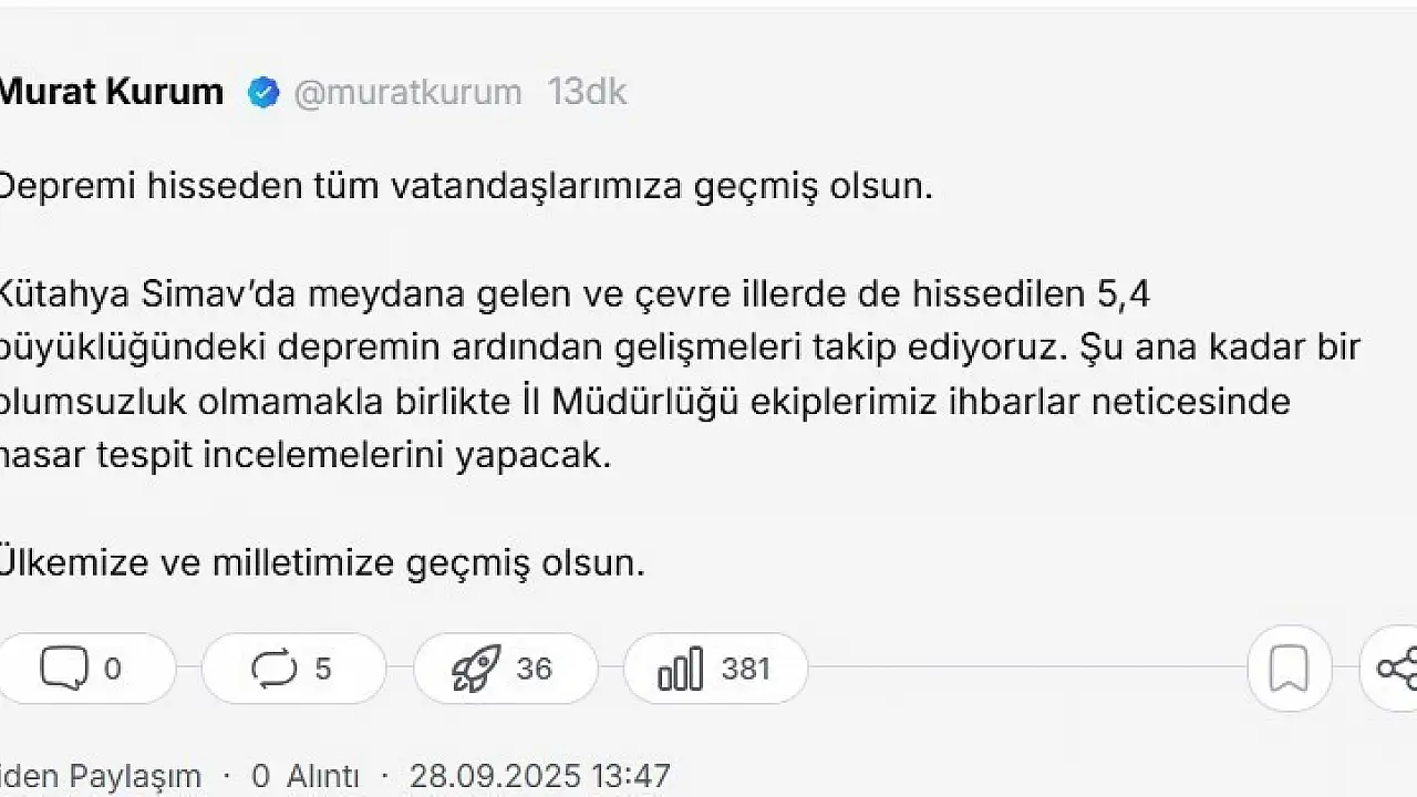 "Depremi hisseden tüm vatandaşlarımıza geçmiş olsun. Kütahya Simav’da meydana gelen ve çevre illerde de hissedilen 5,4 büyüklüğündeki depremin ardından gelişmeleri takip ediyoruz. Şu ana kadar bir olumsuzluk olmamakla birlikte İl Müdürlüğü ekiplerimiz ihbarlar neticesinde hasar tespit incelemelerini yapacak. Ülkemize ve milletimize geçmiş olsun."