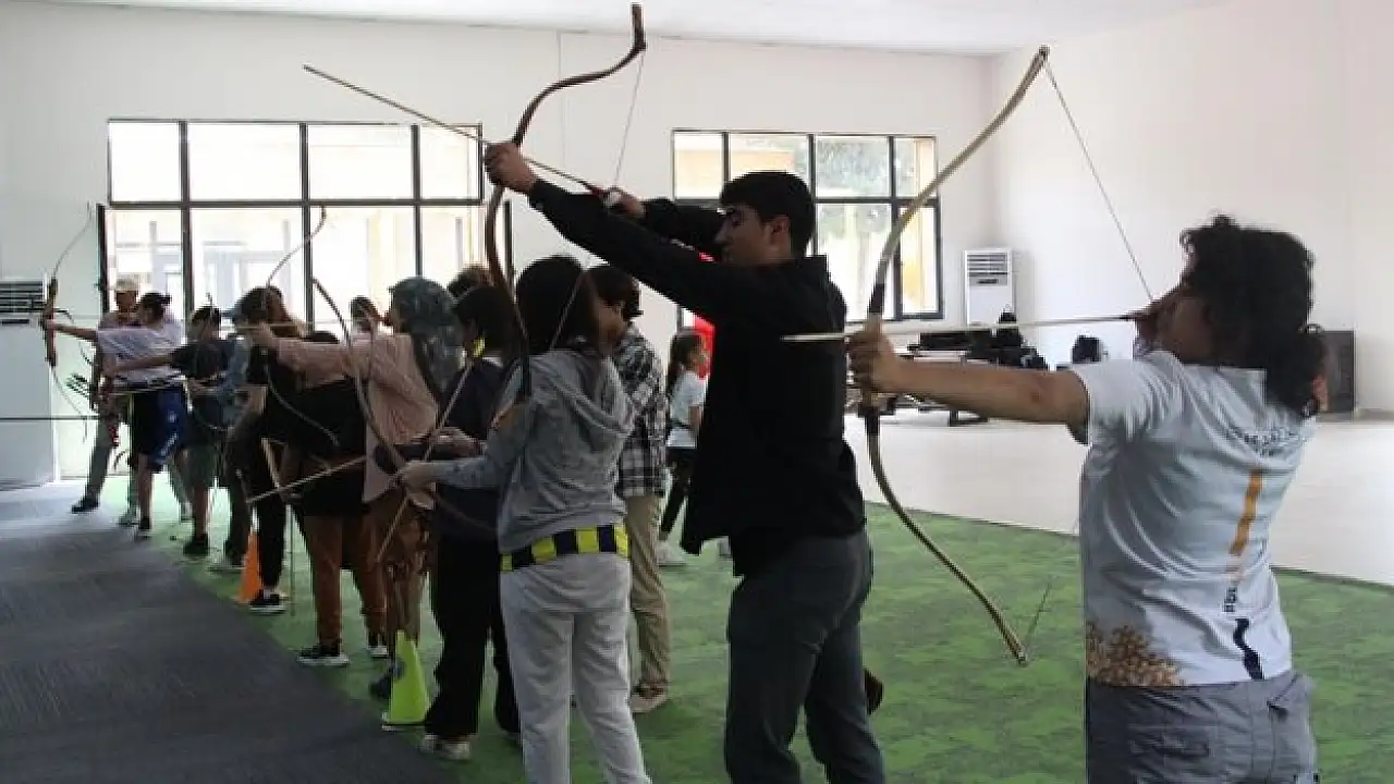 Depremlerden etkilenen Hatay'ın İskenderun ilçesine açılan okçuluk kursuna katılan 8-24 yaş arası 40 öğrenci, ulusal ve uluslararası yarışmalarda derece alabilmek için yay çekiyor.