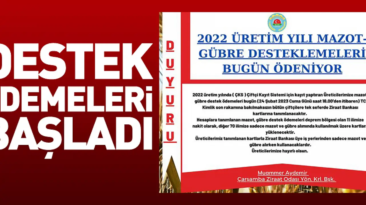 Üreticilere tanımlanan kartlarla sadece mazot ve gübre alırken kullabileceklerini aktaran Başkan Aydemir, “2022 üretim yılında ( ÇKS ) Çiftçi Kayıt Sistemi için kayıt yaptıran Üreticilerimize mazot, gübre destek ödemeleri 24 Şubat 2023 Cuma Günü saat 18.00'den itibaren TC Kimlik son rakamına bakılmaksızın bütün çiftçilere tek seferde Ziraat Bankası kartlarına tanımlanacaktır. Hesaplara tanımlanan mazot, gübre destek ödemeleri deprem bölgesi olan 11 ilimize nakit olarak, diğer 70 ilimize sadece mazot ve gübre alımında kullanılmak üzere kartlara yüklenecektir. Üreticilerimiz tanımlanan kartlarla Ziraat Bankası üye iş yerlerinden sadece mazot ve gübre alırken kullanacaklardır. Üreticilerimize hayırlı olsun.” İfadelerini kullandı.