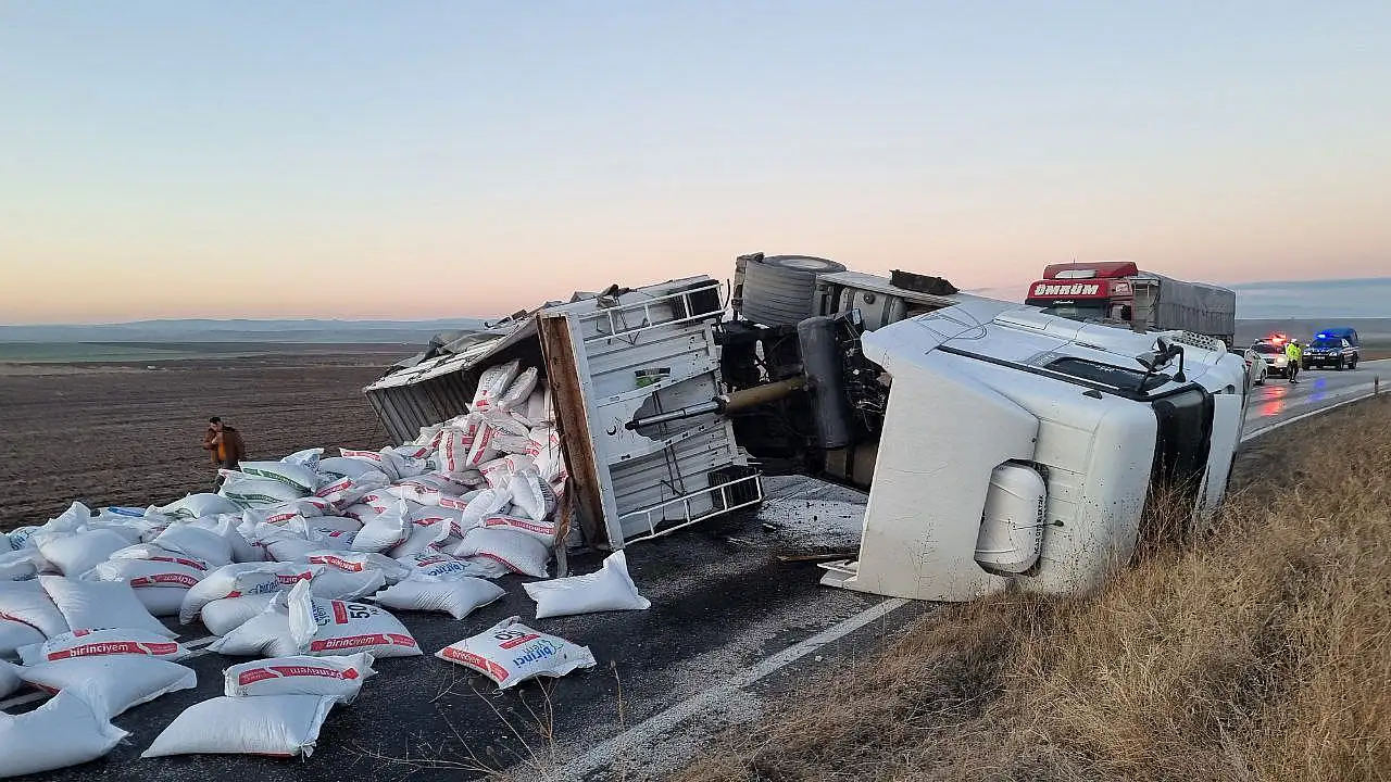 Çorum'da yem yüklü tırın devrilmesi sonucu sürücü yaralandı, kaza nedeniyle Alaca-Zile kara yolu ulaşıma kapandı.