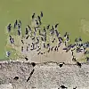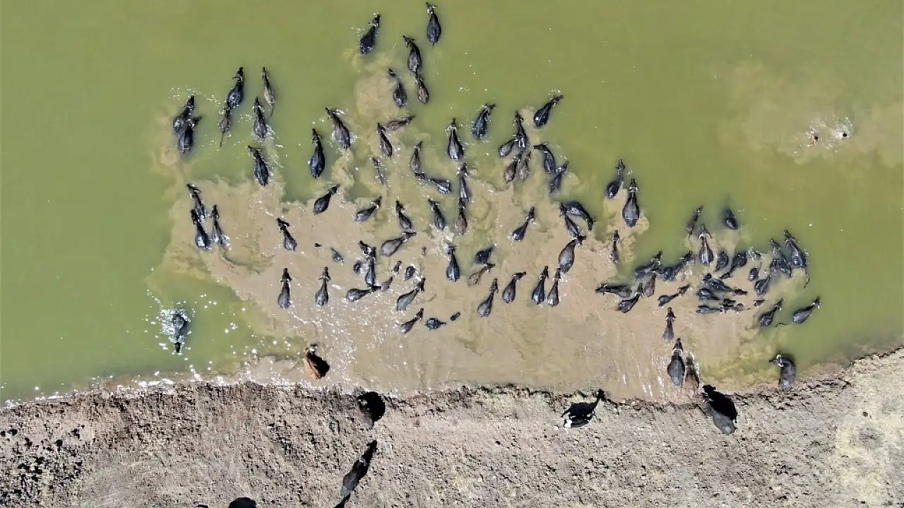Türkiye'de Eyyam-ı Bahur sıcaklıkları etkisini gösterirken, Diyarbakır'da mevsim normallerinin üzerinde seyreden hava sıcaklığından bunalan mandalar serinlemek için göletlere giriyor. Afrika'yı aratmayan o görüntüler dron ile havadan görüntülendi.