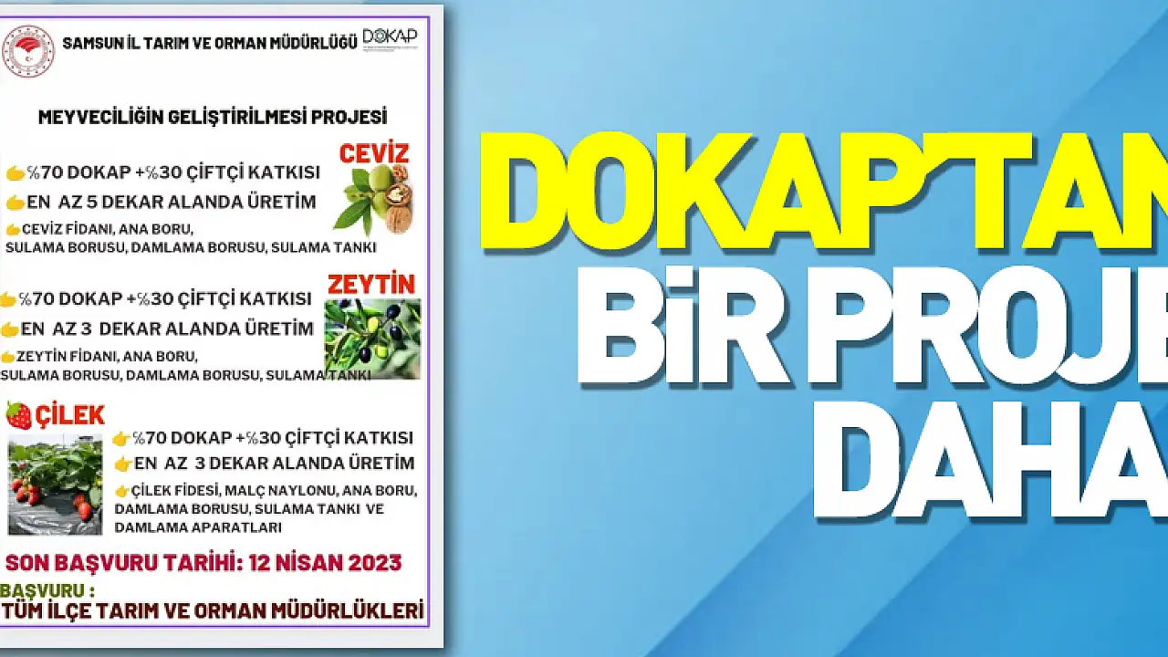 DOKAP Başkanlığı tarafından tarım üreticilerine yönelik Meyveciliğin Geliştirilmesi Projesi hazırlandı. Küçük ölçekli bitkisel üretim işletmelerinin gelirlerinin arttırılması, çeşitlendirilmesi, bitkisel üretimde verim ve kaliteyi artıracak uygulamaların yaygınlaştırılması, bitkisel üretimde yeni üretim tekniklerinin ve kültürel uygulamaların üreticilere ulaştırılması amacıyla hazırlanan proje, DOKAP Başkanlığı önderliğinde "Meyveciliği Geliştirilmesi Projesi" adı altında üreticilere uygulanacak. Sosyal medya hesaplarından duyuru yayınlayan DOKAP yetkilileri Projenin %70’nin DOKAP Başkanlığı tarafından karşılanacağını da belirtti.