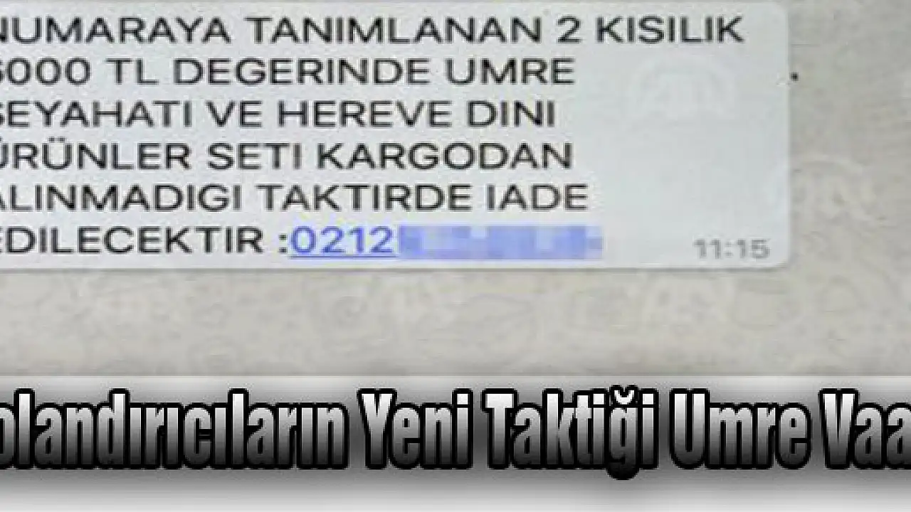Son yıllarda bir çok yöntemle insanları mağdur eden telefon dolandırıcılarının, cep telefonlarına gönderdikleri 'Umre Seyahati ve Dini Ürünler Seti Kazandınız' mesajıyla vatandaşları dolandırmaya çalıştığı öğrenildi