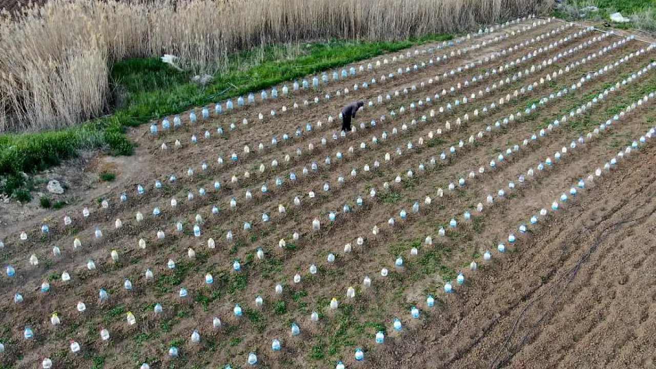 Çiftçi Naci Kılıç, bidonları soğuk ve dolu yağışından korumak için fidelerin üzerlerini kapattığını belirterek, “Bazen dolu oluyor, bazen de ayaz oluyor, soğuk oluyor. Ondan dolayı erken yetişsin diye 600 tane domates ektim. Bu domatesleri korumak için hurdacıdan bidon aldım. Bidonların alt tarafını kestim, domates fideleri erken yetişsin diye üzerlerine geçirdim. Bu sayede fideleri doludan, soğuktan koruyorum. Daha önceleri naylon çekiyordum. O da biraz zor oluyordu. Bir de bunu deneyeyim dedim. 20 senedir nasıl erken yetiştiririm diyerek deniyorum. Bidonların faydası var, sebzeler 1 ay önce yetişiyor” dedi.