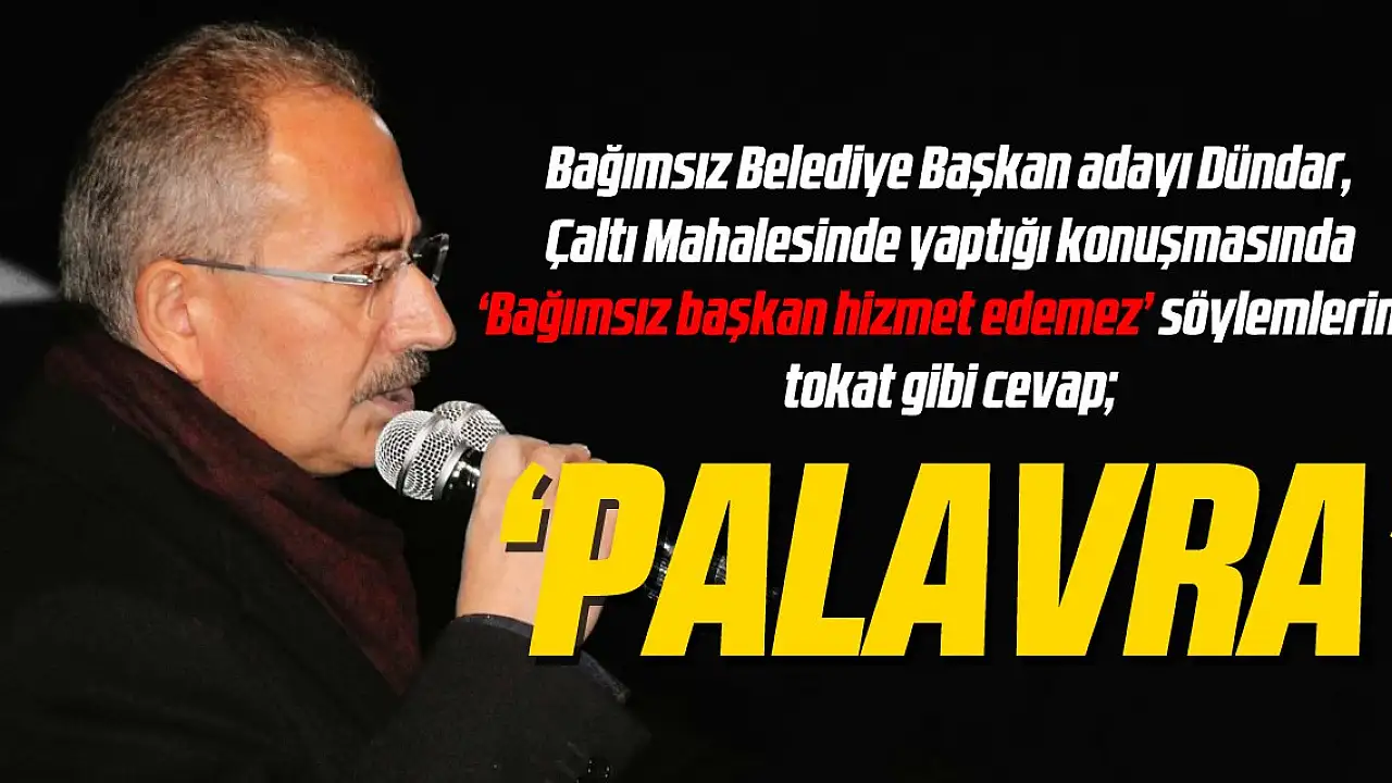 Dündar, konuşmasının devamında “Bağımsız Belediye Başkanı ödenek alamaz, çalışamaz. Bunları duyuyorsunuz değil mi? Bunlar palavra. Bunların gerçekle hiçbir alakası yok. Sizlerin huzuruna, sizlerin karşısına Belediye Başkan Adayı olmak üzere çıkanların ağzına yakışmayacak sözler! Böyle adaylık, böyle belediye başkanlığı, böyle yanıltmalar olmaz. Bunlar yakışmaz. Bunlar Çarşamba’yı, Çarşambalıyı ne zannediyor? Bunlar Çarşambalıya hakarettir. 31 Martta bu tür söylemlerden ve bu palavralardan kurtuluyoruz.”
