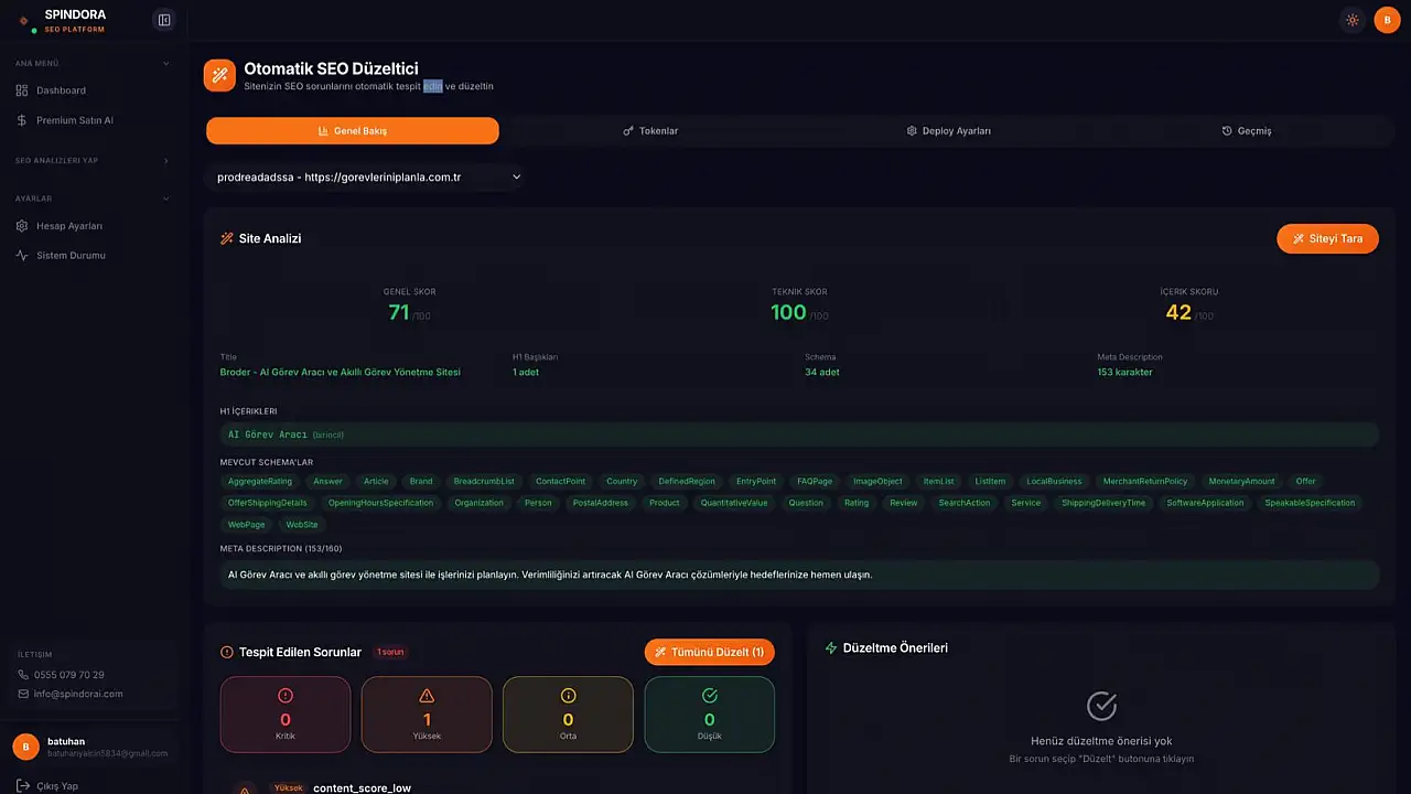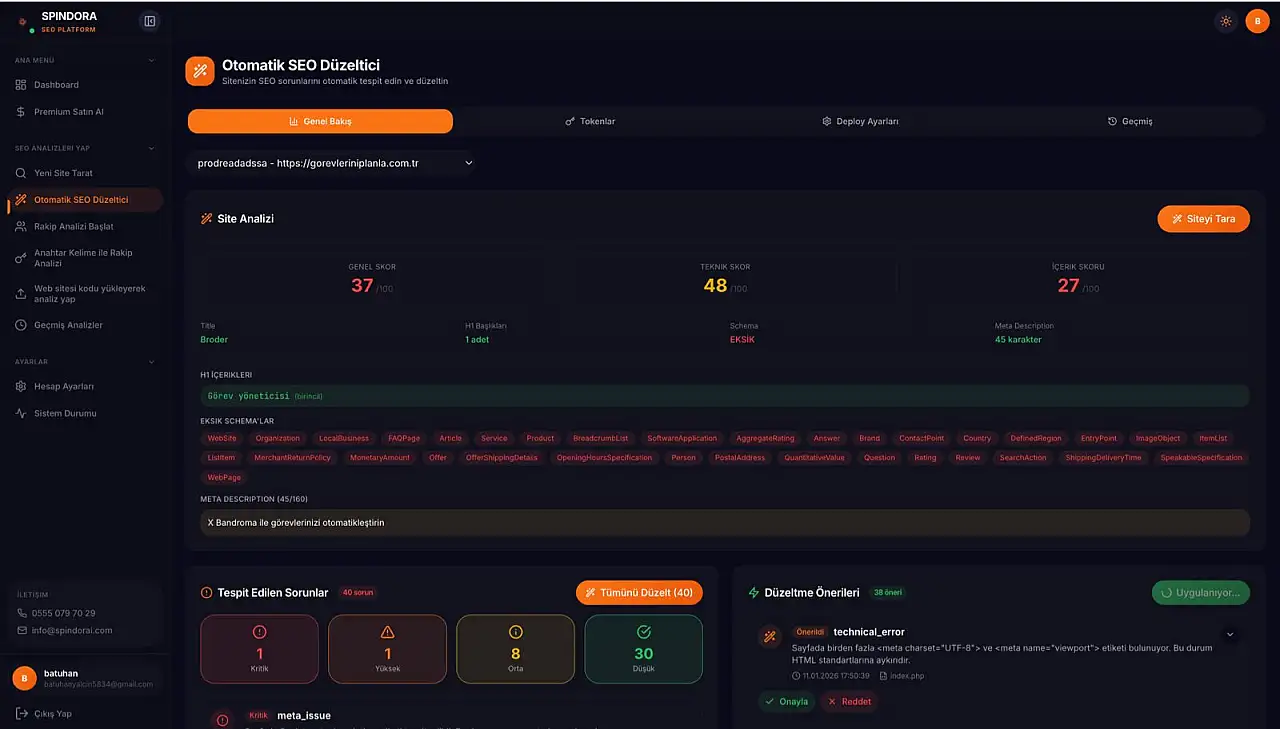 E-ticaret sitelerindeki SEO sorunlarını otomatik olarak düzeltmek için otomatik seo düzeltme aracı sistemleri, büyük ölçekli optimizasyon imkanı sunuyor. Bu sistemler, ürün sayfalarındaki meta etiketleri, başlıklar, açıklamalar ve içerik optimizasyonlarını otomatik olarak gerçekleştiriyor. Spindorai.com, e-ticaret işletmelerinin SEO süreçlerini otomatikleştiren otomatik seo düzeltme aracı çözümleriyle büyük ölçekli optimizasyon sağlıyor.