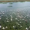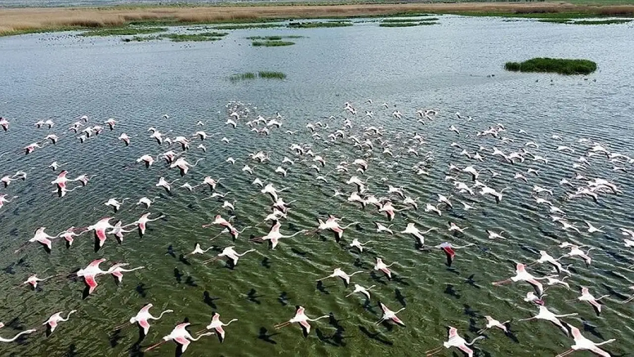 Afyonkarahisar'ın Bolvadin ilçesi sınırlarındaki birçok göçmen kuşa ev sahipliği yapan Eber Gölü, flamingoların uğrak yeri oldu.