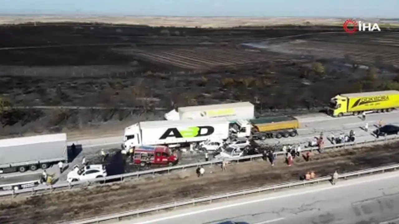 Kaza, Edirne Kırklareli yolu Köseömer mevkiinde meydana geldi. Yolun kenarında çıkan anız yangını sebebiyle dumanların etrafa yayılmasıyla çok sayıda tır ve otomobilin karıştığı kazada 2 kişi hayatını kaybetti, 35 kişi yaralandı.