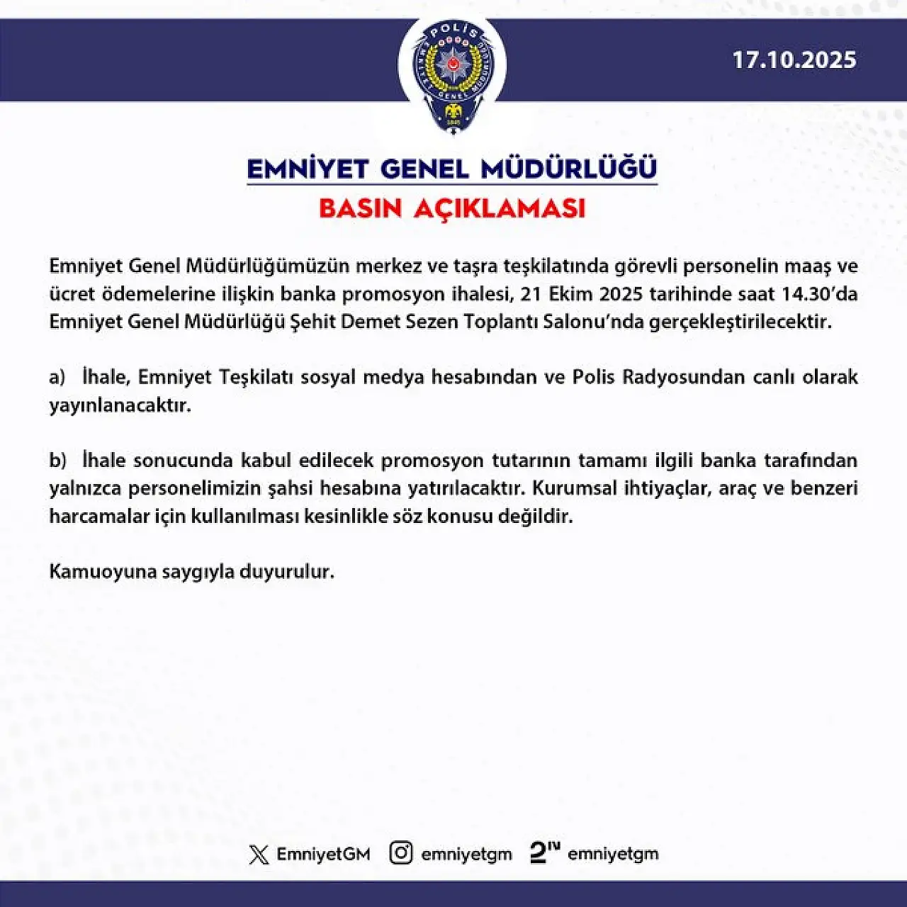 EGM maaş promosyon ihalesi 21 Ekim Pazartesi günü saat 14.30’da Emniyet Genel Müdürlüğü Şehit Demet Sezen Toplantı Salonu’nda yapılacak. İhale süreci, Emniyet Teşkilatı’nın resmî sosyal medya hesaplarından ve Polis Radyosu üzerinden canlı olarak yayınlanacak. Böylece hem teşkilat mensupları hem de kamuoyu süreci şeffaf bir şekilde takip edebilecek.