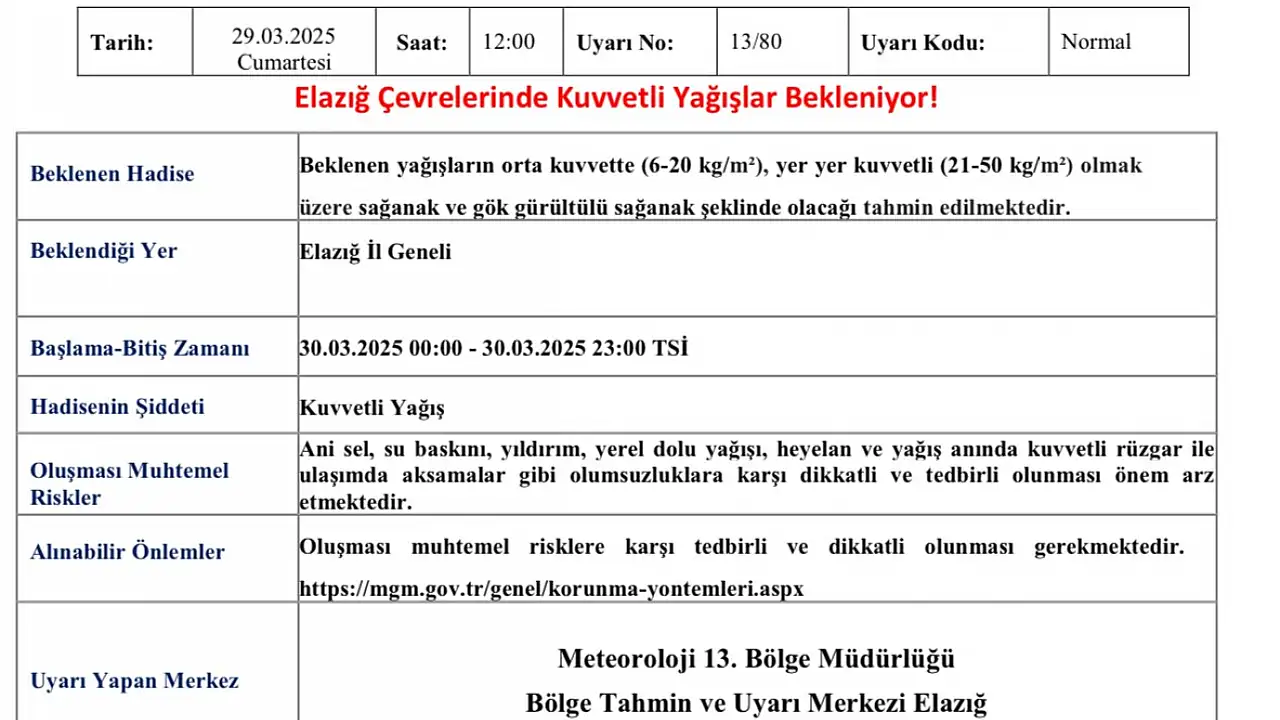 Meteoroloji 13. Bölge Müdürlüğü, bölge genelinde beklenen kuvvetli yağışlar nedeniyle vatandaşları uyardı. Yapılan açıklamada, ani sel, su baskını, yıldırım, yerel dolu yağışı, heyelan ve yağış anında kuvvetli rüzgar gibi olumsuzlukların yaşanabileceği belirtildi. Özellikle ulaşımda aksamalar gibi risklere karşı dikkatli ve tedbirli olunması gerektiği vurgulandı. Yağışların ani ve şiddetli olabileceği ifade edilirken, vatandaşların gerekli önlemleri alarak can ve mal kaybını önlemek adına dikkatli olmaları istendi.