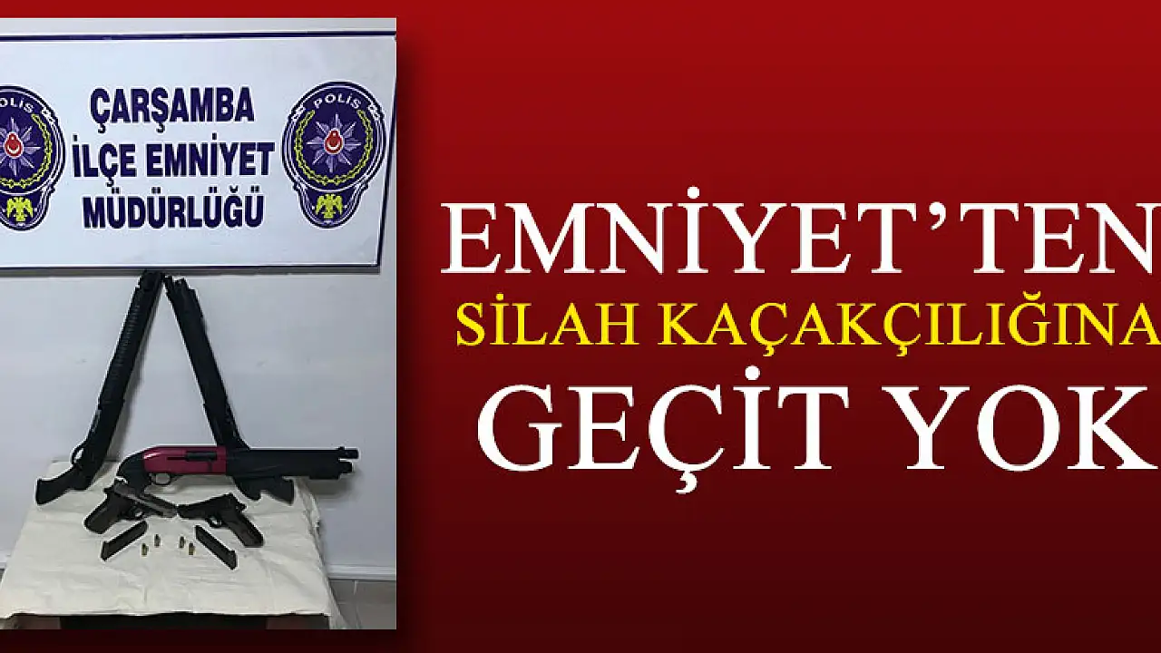 Çarşamba ilçesinde Silah Ticareti ve Kaçakçılığını önlemek amacıyla Asayiş Büro Amirliği ekiplerince yapılan çalışmalar sonucunda edinilen istihbaratı değerlendiren Çarşamba İlçe Emniyet Müdürlüğü Asayiş Büro Amirliği ekipleri yaptıkları operasyonda 2 adet ruhsatsız tabanca, 3 Adet Ruhsatsız Pompalı av tüfeği ve bu silahlara ait 4 adet 9 mm çaplı fişek elde edilirken, 1 kişi gözaltına alındığı öğrenildi.
