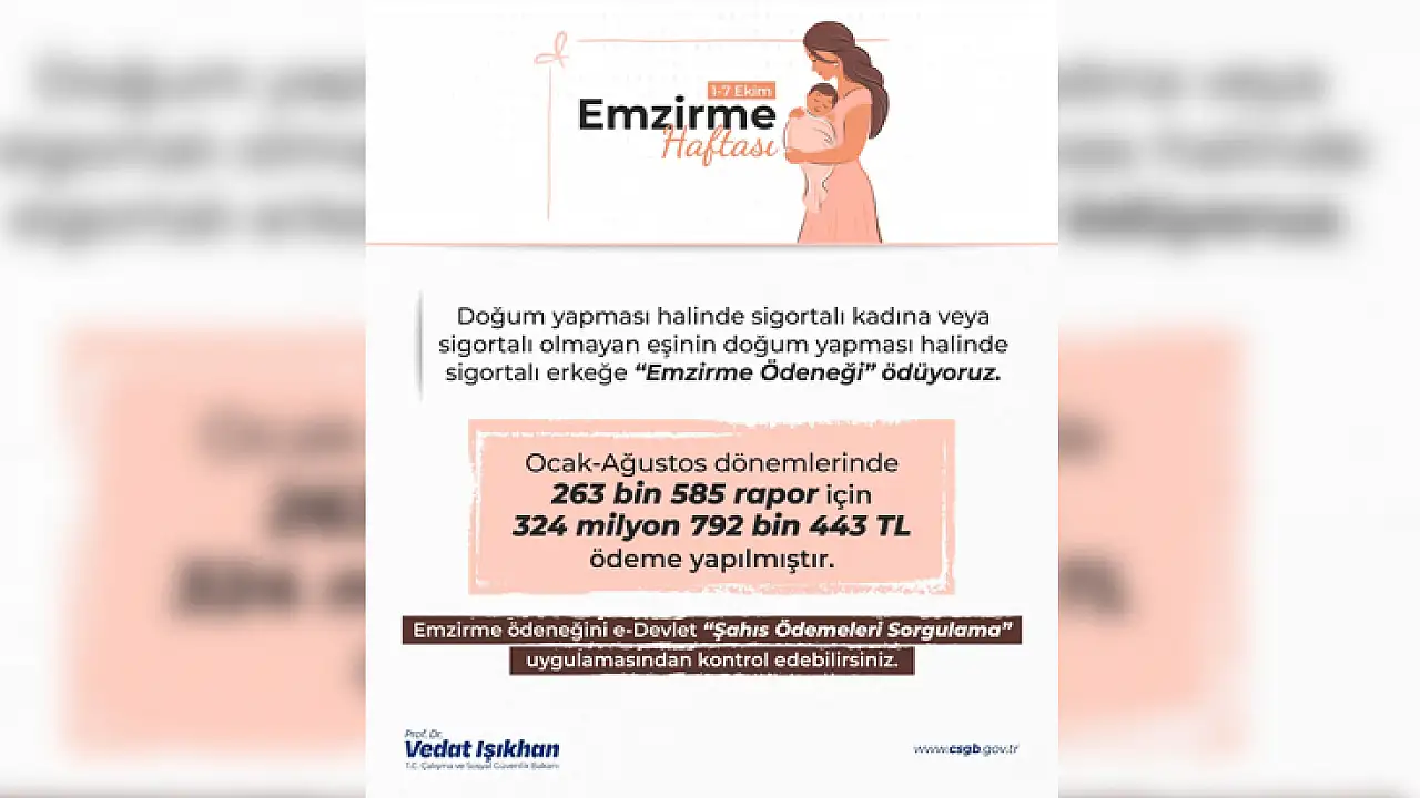 Çalışma ve Sosyal Güvenlik Bakanı Vedat Işıkhan, emzirme ödeneklerine ilişkin yaptığı açıklamada, bu yılın Ocak-Ağustos döneminde 263 binden fazla rapor için yaklaşık 325 milyon lira ödeme yapıldığını duyurdu.