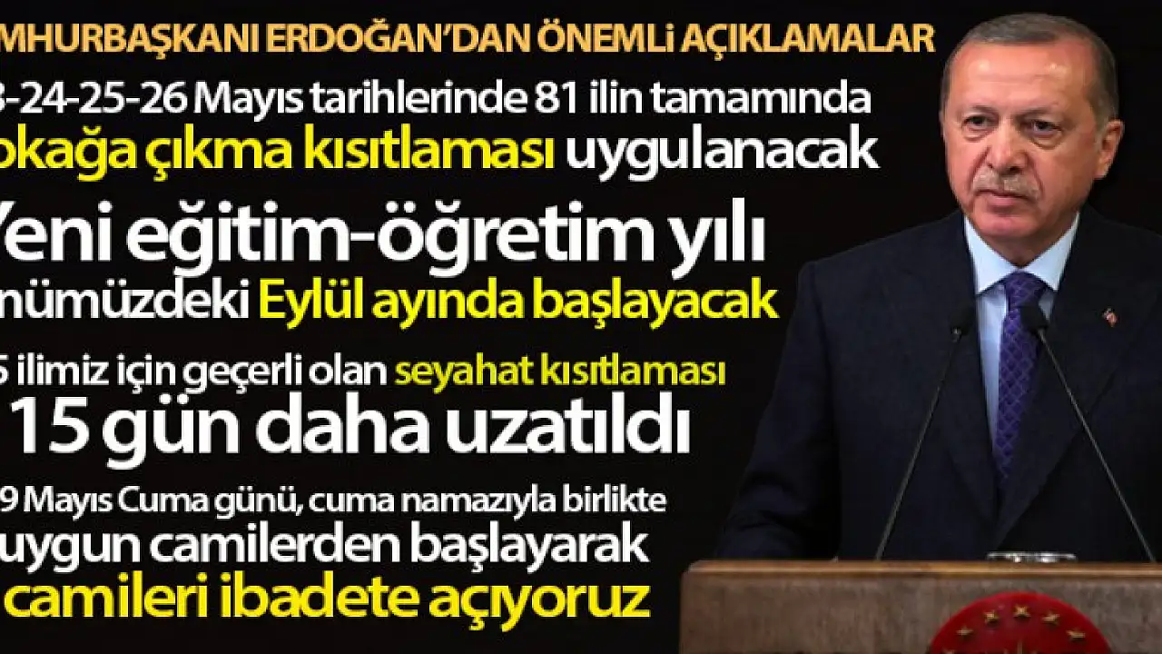Erdoğan, "23-24-25-26 Mayıs tarihlerinde 81 ilin tamamında sokağa çıkma kısıtlaması uygulanacak. Yeni eğitim-öğretim yılı önümüzdeki Eylül ayında başlayacak. "29 Mayıs Cuma günü, cuma namazıyla birlikte uygun camilerden başlayarak camileri ibadete açıyoruz" dedi.