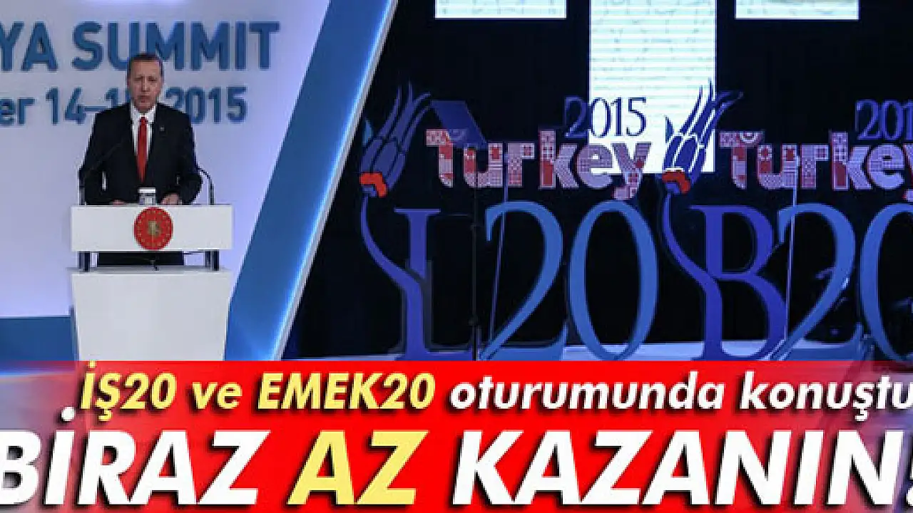 Dünyanın ve Türk iş dünyasının önde gelenlerinin yer aldığı toplantıda Cumhurbaşkanı Recep Tayyip Erdoğan, asgari ve ortalama ücretlerde ciddi artışlar kaydettiklerini belirtti. Erdoğan, "Etkin ekonomi ve istidam politikalarının uygulanabilmesi için işçi işveren arasında güçlü bir sosyal diyaloğun tesis edilmesi şarttır. Bunun G20 çerçevesinde başarılabilmiş olması sevindiricidir. Türkiye, güçlü sürdürülebilir ve dengeli büyümeye kapsayıcılığı da dahil ettik. Büyüme sadece rakamlardan ibaret değildir. Büyümenin kalitesi ve niteliği de önemlidir. Toplumdaki tüm kesimlerin, refah artışından pay almaları gerekiyor. Biz kapsayıcılığı daha fazla kaliteli istihdam oluşturulması eşitsizliklerin giderilmesi olarak görüyoruz. Sizler de İş20 ve Emek20 olarak yaptığınız çalışmalarda kapsayıcı büyümeyi benimseyerek G20'ye katkılarınızı sundunuz. Alın terini kutsal gören, emeğin karşılığının zamanında verilmesini emreden bir medeniyetin mensupları olarak bu konu bizim için çok önemli. Türkiye olarak başarılı sonuçlar elde ettiğimizi ifade etmek isterim. Asgari ücrette ve ortalama ücretlerde ciddi artışlar kaydettik" dedi.