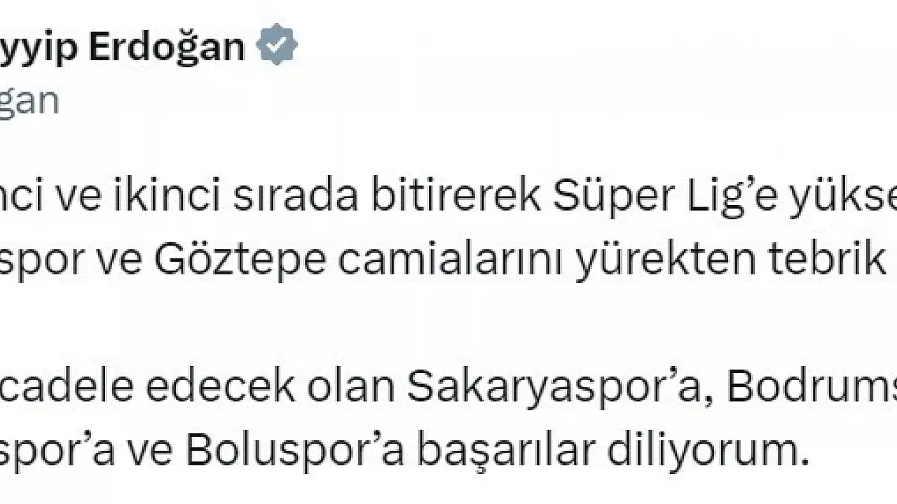 Cumhurbaşkanı Recep Tayyip Erdoğan, TFF 1. Lig’i birinci ve ikinci sırada bitirerek Süper Lig’e yükselen Eyüpspor ve Göztepe Spor Kulübünü tebrik etti.