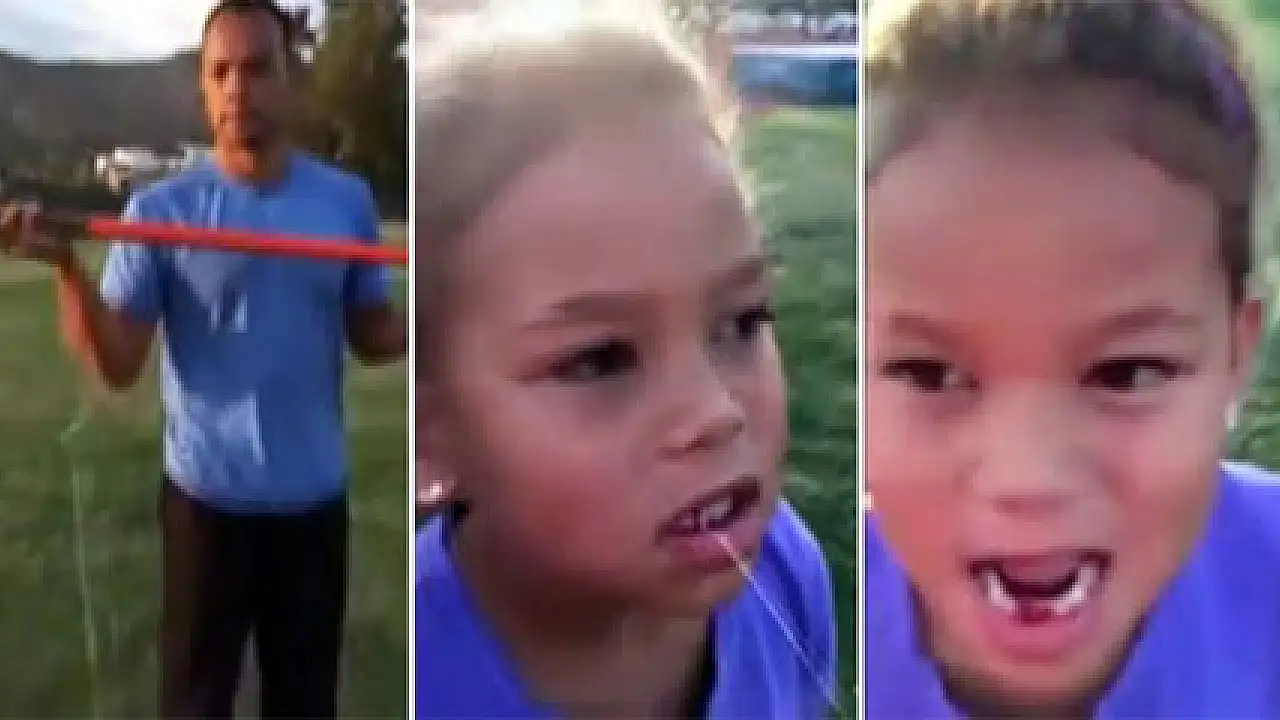 ABD'li atlet Bryan Clay'ın, küçük kızının dişine bağladığı ipin ucunu bir ciritin ucuna bağlayarak kızının dişini çektiği anlar saniye saniye görüntülendi.