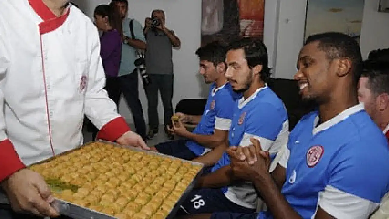 Antalyasporlu yıldız futbolcu Eto'o, AK Parti Genel Başkan Yardımcısı Mevlüt Çavuşoğlu'nun kulübü ziyareti sırasında, ikram edilen baklavayı geri çevirerek, '3 haftada 3 kilo verdim' dedi.