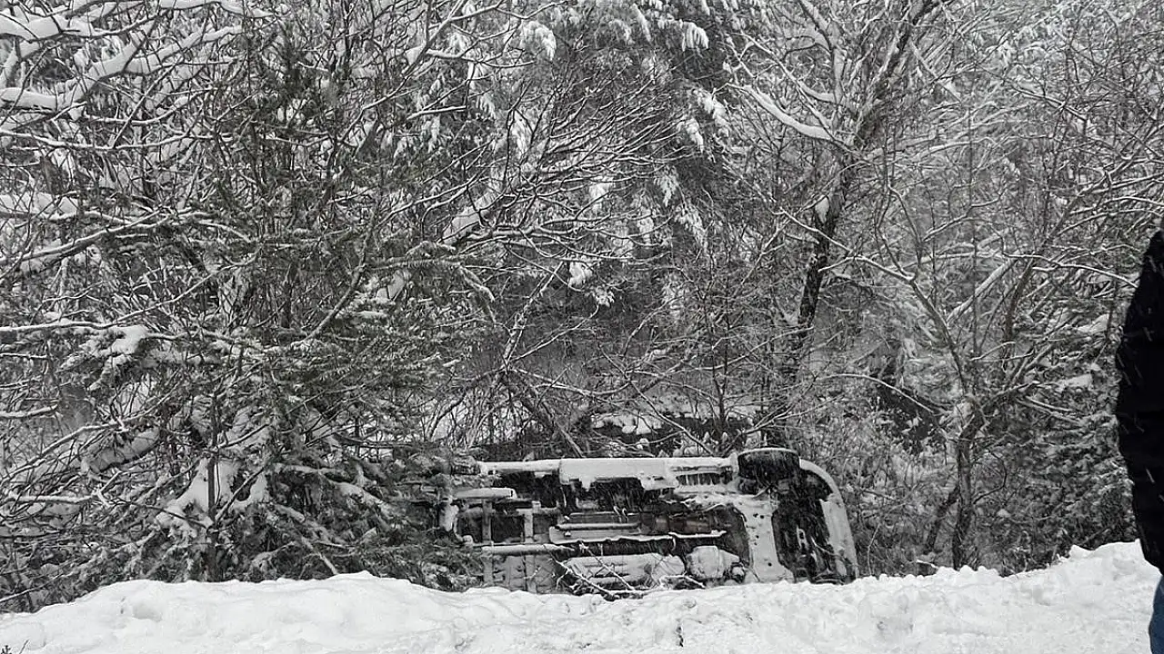 Gümüşhane'nin Torul ilçesinde bir ambulans, kar yağışının yolları etkilemesinin ardından dereye yuvarlandı.