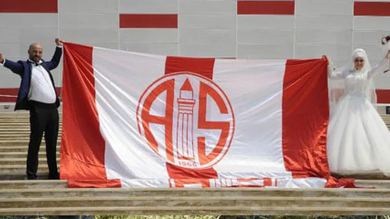 Antalya'da bir gelin, fanatik Antalyasporlu eşine takımın dev bayrağı ile yeni Antalya stadyumu önünde sürpriz yaptı. Bayrakla poz veren çift, ilginç bir düğün fotoğrafına imza attı.