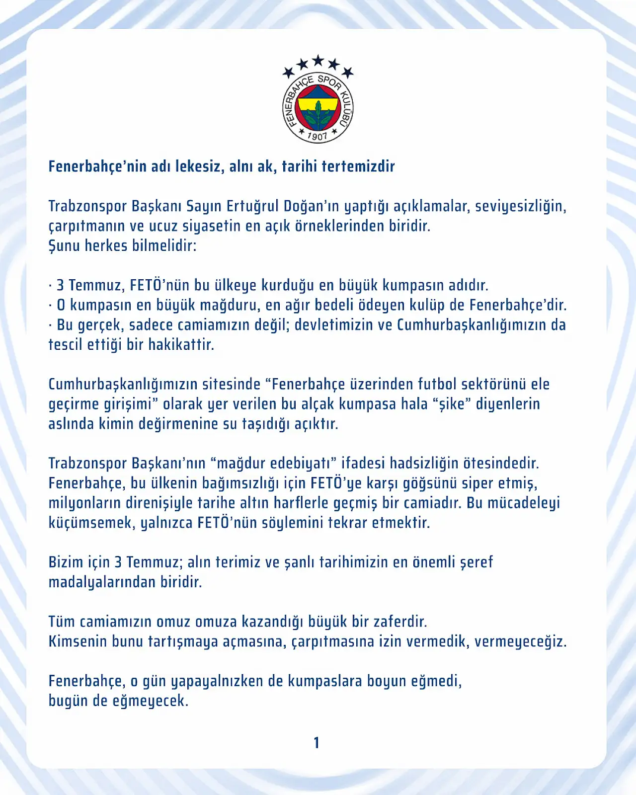 Yapılan açıklamada, " Fenerbahçe’nin adı lekesiz, alnı ak, tarihi tertemizdir! Trabzonspor Başkanı’nın “mağdur edebiyatı” ifadesi hadsizliğin ötesindedir. Fenerbahçe, bu ülkenin bağımsızlığı için FETÖ’ye karşı göğsünü siper etmiş, milyonların direnişiyle tarihe altın harflerle geçmiş bir camiadır. Bu mücadeleyi küçümsemek, yalnızca FETÖ’nün söylemini tekrar etmektir. Sayın Ertuğrul Doğan başkanlığı bırakana kadar Kulüpler Birliği faaliyetlerimizi durduruyoruz” ifadeleri yer aldı.