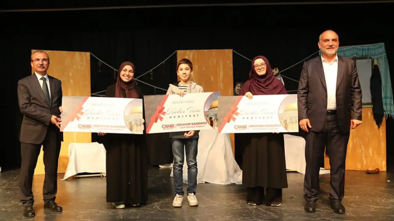 Canik Belediye Başkanı İbrahim Sandıkçı, tiyatro oyununda düzenlenen çekiliş etkinliğiyle seyirciler arasından üç katılımcıya Kudüs Turu hediye etti. Sezai Karakoç Canik Kültür Merkezi’nde sahnelenen tiyatro oyununa AK Parti Siyasi ve Hukuki İşler Başkan Yardımcısı ve Samsun Milletvekili Orhan Kırcalı, Canik Belediye Başkanı İbrahim Sandıkçı, eşi Selma Sandıkçı, protokol üyeleri ve yüzlerce sanatsever katıldı.