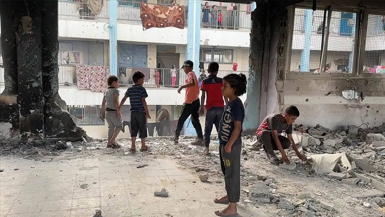 İsrail'in, Gazze Şeridi'nin güneyindeki Refah'a saldırılarından kaçarak Han Yunus'a sığınan Filistinliler, yıkılmış ve yakılmış UNRWA okullarına yerleşmek zorunda kalıyor.