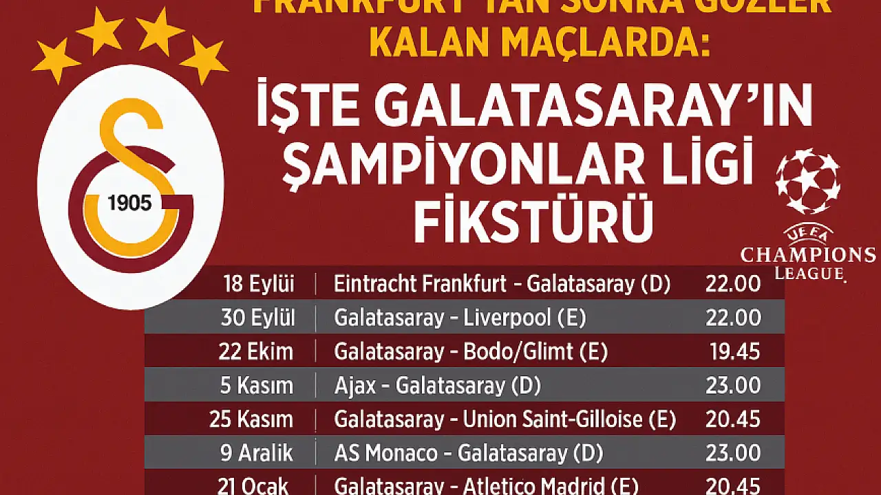Galatasaray, UEFA Şampiyonlar Ligi'nde bu sezon Türkiye'yi temsil eden tek takım olarak sahne alıyor. Dün akşam oynanan açılış maçında Eintracht Frankfurt'a mağlup olan sarı-kırmızılılarda gözler şimdi diğer Avrupa sınavlarına çevrildi. Taraftarlar, Devler Ligi arenasında Galatasaray'ı bekleyen karşılaşmaların tarihlerini merakla araştırıyor.