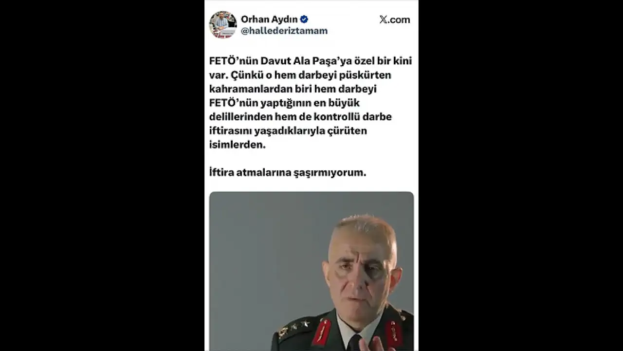 15 Temmuz gecesi vatan hainlerine karşı göğsünü siper ederken, 8 kurşunla mucize eseri hayatta kalan Samsun Garnizon Komutanı Gazi Tümgeneral Davut Ala’nın, FETÖ’cü hesapların sistematik iftiralarına maruz kalmaya devam ettiğini iddia eden Araştırmacı Yazar Orhan Aydın sosyal medya hesabı üzerinden “FETÖ’nün Davut Ala Paşa’ya özel bir kini var. Çünkü o hem darbeyi püskürten kahramanlardan biri hem darbeyi FETÖ’nün yaptığının en büyük delillerinden hem de kontrollü darbe iftirasını yaşadıklarıyla çürüten isimlerden. İftira atmalarına şaşırmıyorum.” ifadelerini kullandı.