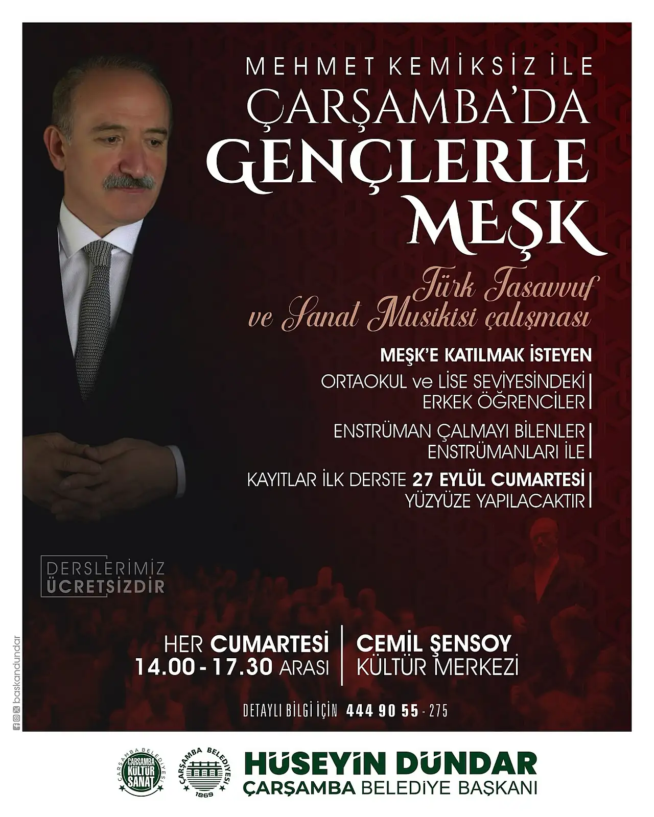 Gençleri bu anlamlı çalışmaya davet eden Çarşamba Belediye Başkanı Hüseyin Dündar, “Çarşamba’mızda meşk derslerimiz başlıyor. Türk Tasavvuf Müziği Sanatçımız, hemşehrimiz Mehmet Kemiksiz ile “Çarşamba’da Gençlerle Meşk” dersleri her cumartesi Cemil Şensoy Kültür Merkezimizde gerçekleştirilecektir. Türk Tasavvuf ve Sanat Musikisine ilgi duyan gençlerimizi bu anlamlı çalışmaya davet ediyorum.” İfadelerini kullandı.
