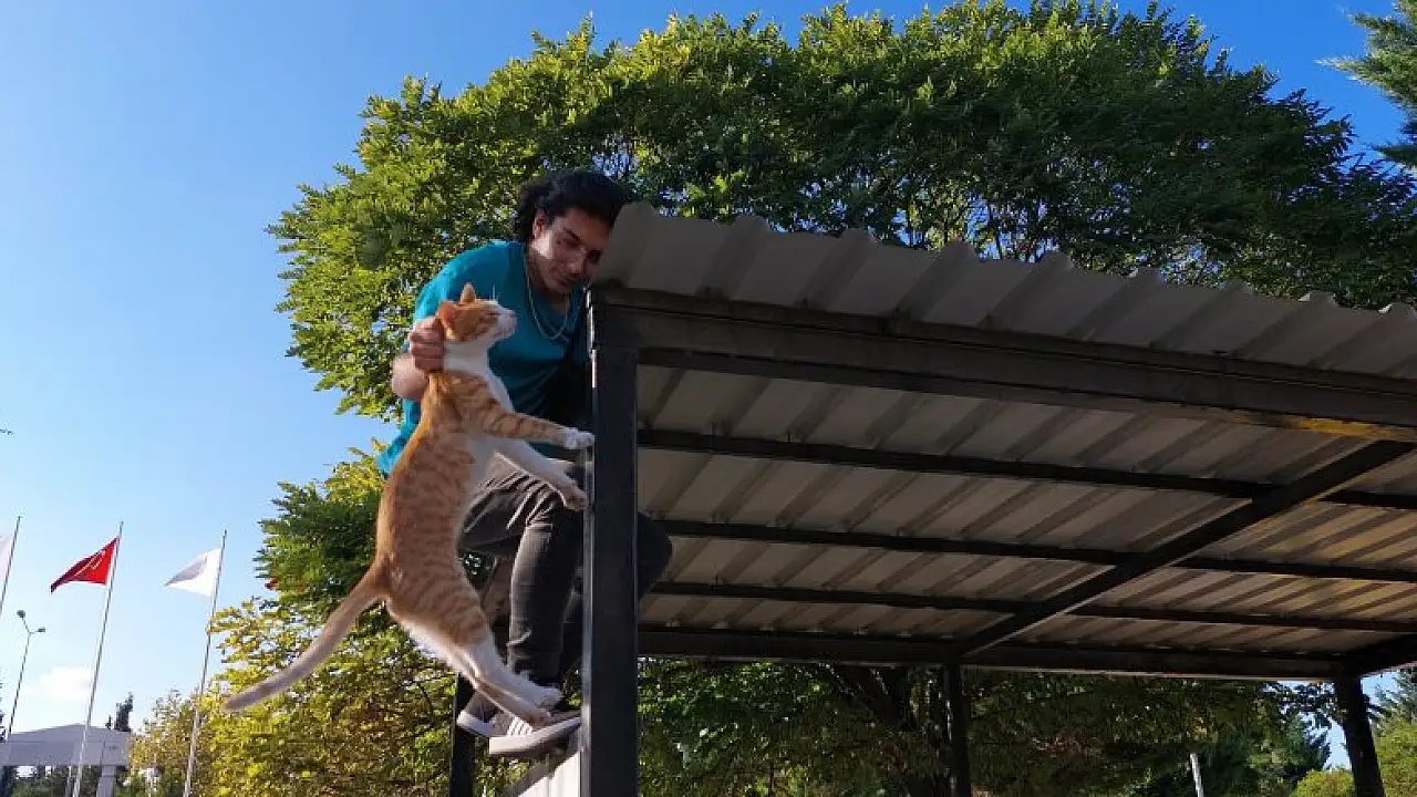 Edinilen bilgiye göre, Samsun Eğitim ve Araştırma Hastanesi bahçesindeki sigara içme alanının çatısına çıkan kedi burada mahsur kaldı. Kedinin çaresiz bakışlarını gören hastane çalışanı klinik destek personeli Eren Demir kediyi bulunduğu yerden kurtardı. Kedinin uzun süre orada kaldığı öğrendiğini belirten Eren Demir, "Kedi çıktığı çatıdan inememiş. Çaresiz baktığını gördüm. Yan tarafından çatıya uzanıp kediyi kurtardım" dedi.